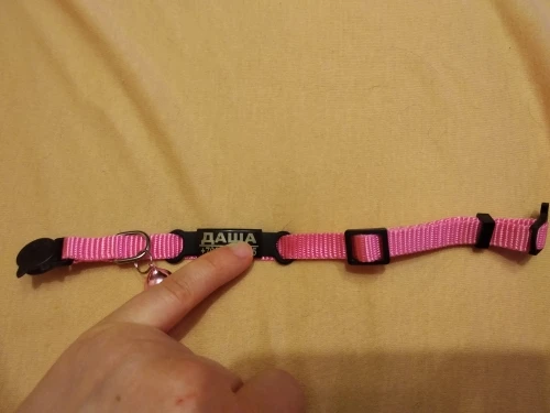 Ошейник супер! Регулируется под любой размер. На кошечке меньше трех месяцев сидит идеально. Сначала её подбешивал колокольчик, но минут через 15 она привыкла к нему. Колокольчик можно снять, если вашему питомцу он не нравится. Надпись написана чётко и правильно, так как я написала продавцу. А ещё порадовала супер быстрая доставка 13 дней. Советую и товар и продавца!
