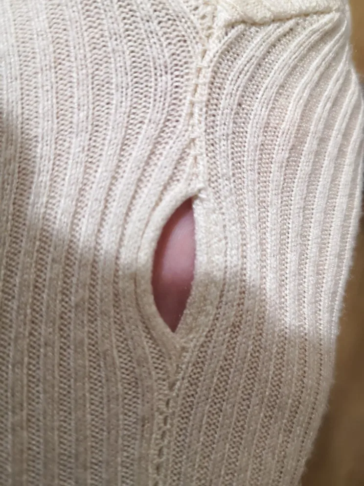 Хорошо сшитый свитер. На нем нет этикеток, рукава короткие. Размер только для размера S, обхват груди 90. Для большего размера не стоит