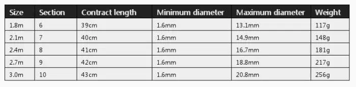 Размер: длина секции, минимальный диаметр, максимальный диаметр, вес