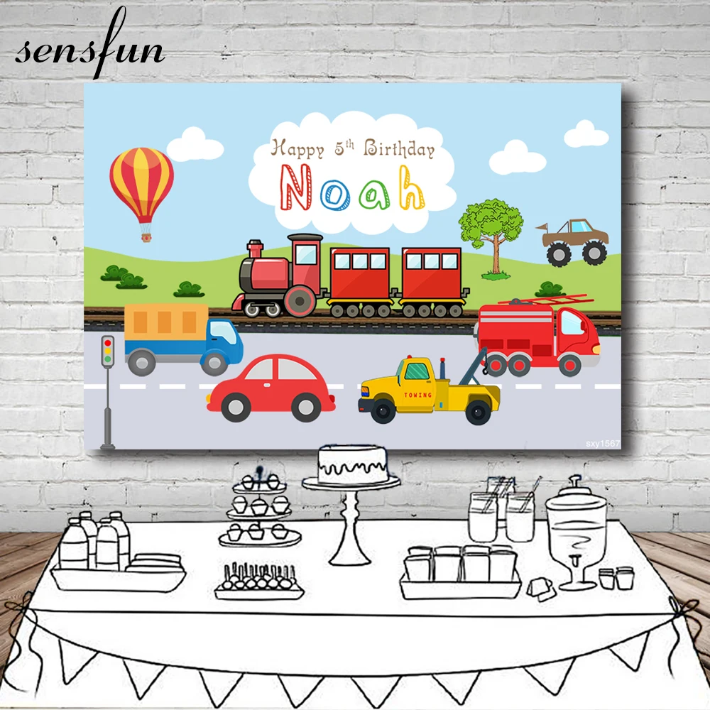 Sensfun героями мультфильма паровозик Томас и его друзья с принтом Тачки для мальчиков, День рождения Фоны для студийной фотосъемки голубое небо облака зеленая трава горячего воздуха фон для фотосессий-воздушный шар