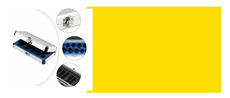 Материал: хромованадиевая сталь (обладает более хорошей износостойкостью и прочностью, чем Хромомолибденовая сталь, первая обычно используется в розетке, вторая используется для отвертки)Размеры SAE-1/4 дюйма, 5/16 дюйма, 3/8 дюйма, 7/16 дюйма, 1/2 дюйма, 9/16 дюйма, 5/8 дюйма, 11/16 дюйма и 3/4 дюйма.Метрические размеры-9 мм, 10 мм, 11 мм, 12 мм, 13 мм, 14 мм, 16 мм, 17 мм и 19 мм.Размер драйвера: 3/8 дюйма
