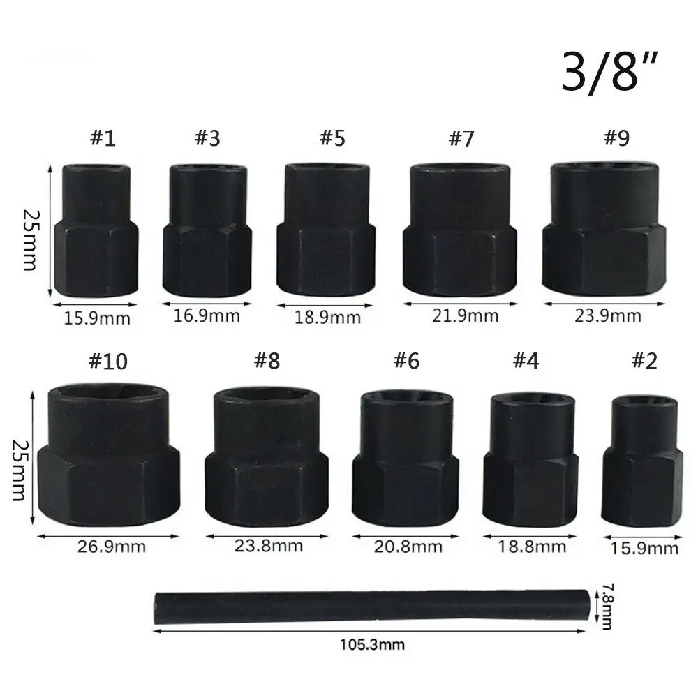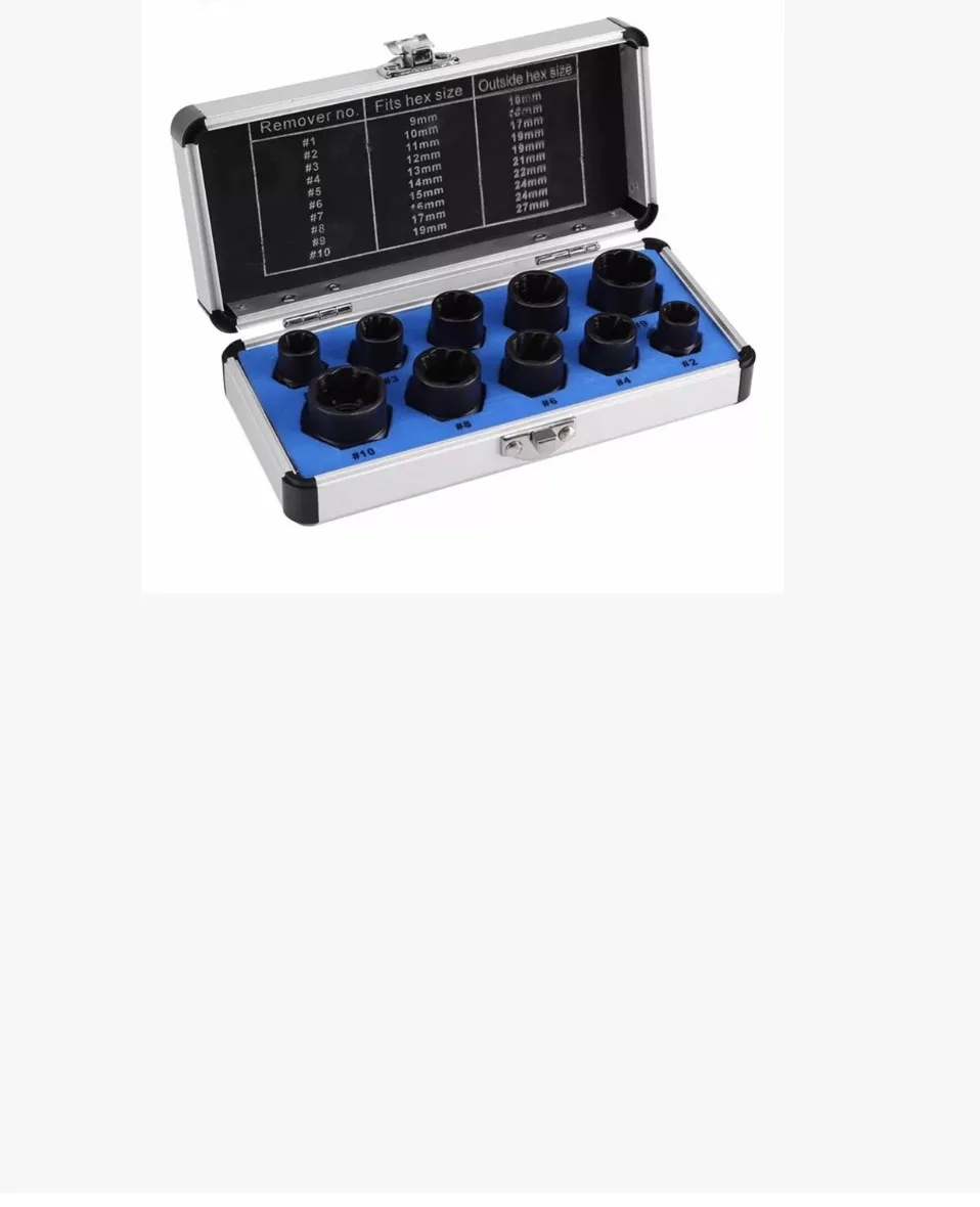 11 ПК Гайка Болт экстрактор гнездо и Томми бар наборСпециально закаленные гнезда с защитой от коррозии предназначены для удаления поврежденных болтов, винтов и гаек.Конструкция скрученного гнезда обеспечивает надежное соединение с закругленным крепежом для извлечения.Инновационный спиральный профиль входит в головку поврежденного винта или гайки, что позволяет легко ослабить его.Квадратный привод 3/8 дюйма для использования с торцевым ключом или ударным ключом.Эти экстракторы со сломанными болтами имеют черную оксидную поверхность, обеспечивают большую прочность и долговечность и предотвращают коррозию.