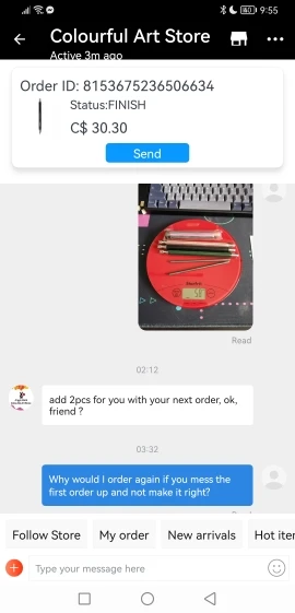 Продавец или фабрика допустили ошибку и прислали мне 1 карандаш по сравнению с 3 заказанными мной. Они не ответили на мое личное сообщение до тех пор, пока я не открою спор через неделю после того, как попробую разрешить этот вопрос. Они использовали какое-то приложение для перевода и в основном просто любили тупым. Взвешивание заказа и бла-бла. Я потерялся только как $10 продукта, но это принцип игры. Просто Поделитесь своим собственным опытом с вами.