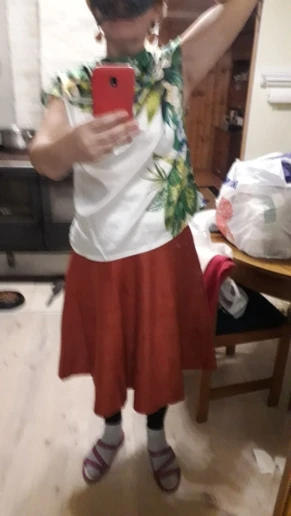 Качество материала прекрасное, очень мягкая и красивая ткань. На талию 77 села прям плотно, причем еле пролезла в бедрах. Застежки или молнии никакой нет, только резинка, так что учтите, что юбку надо будет ещё натянуть. Доставка очень быстрая