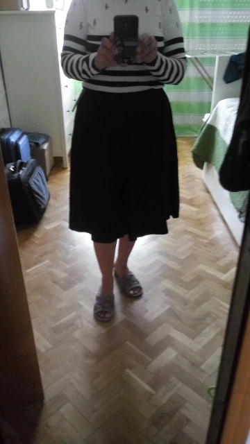Юбка хорошая, но ткань ощутимо тоньше. Брала год назад у этого же продавца бежевую, у нее ткань почти в 2 раза толще была. И у черной в талии теснее, давит, а прошлогодний вариант не давил на живот