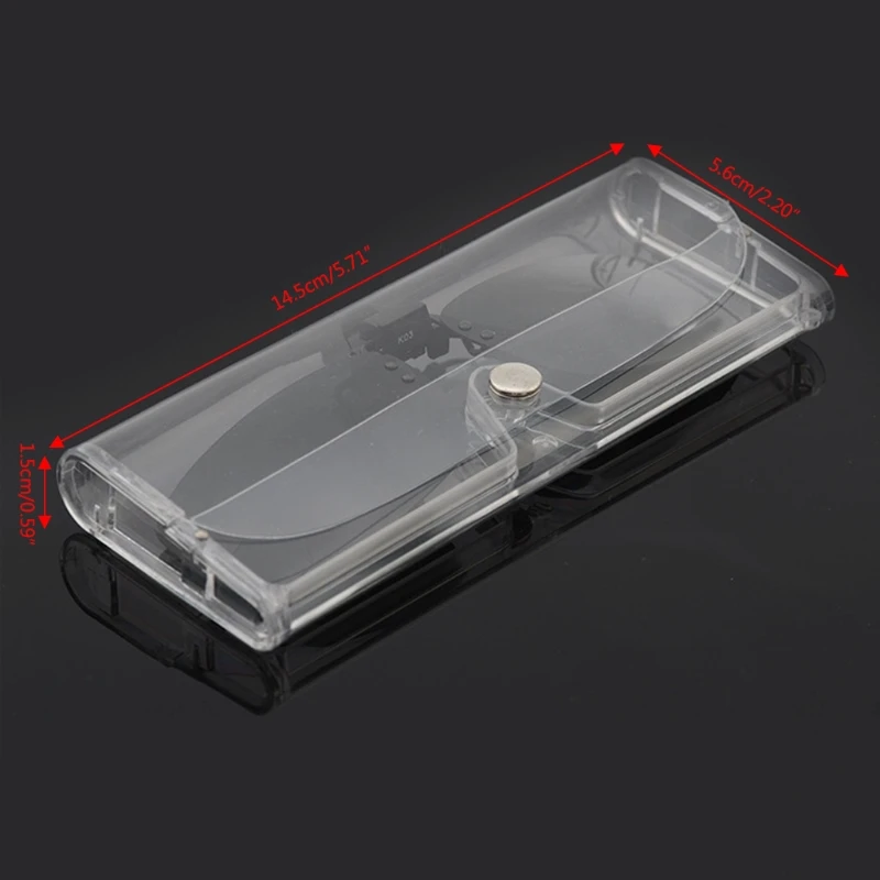 Особенности:Мягкий пластиковый дизайн, модный и прочный.Закрывается кнопкой, легко носить с собой.Подходит для хранения очков С Откидывающейся Крышкой и зажимом.Защитите ваши очки от повреждений и других.Очки в комплект не входят.Спецификация:Материал: пластикРазмер: app.14.5cmx5.6cmx1.5cm/5,71 ''x 2,20'' x 0,59''Цвет: прозрачныйКоличество: 1 шт.