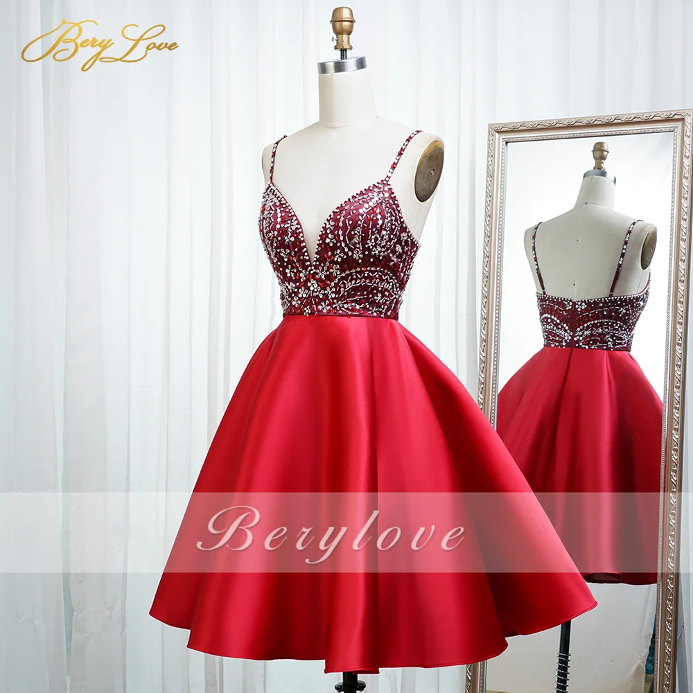 Платье для выпускного вечера BeryLove, Красное Атласное коктейльное платье на тонких бретелях, милое, с кристаллами и бисером, короткое платье для выпускного вечера
