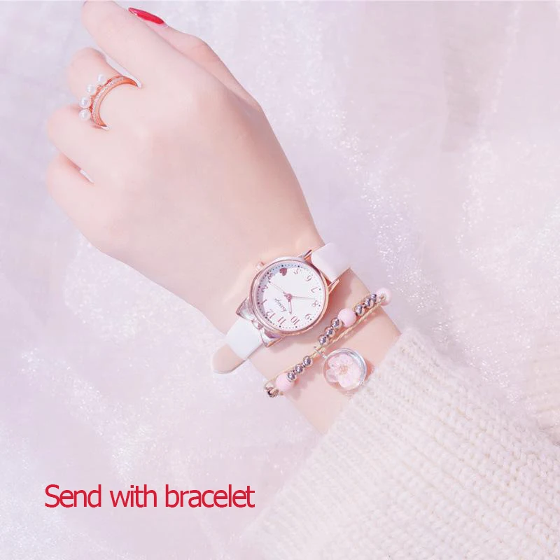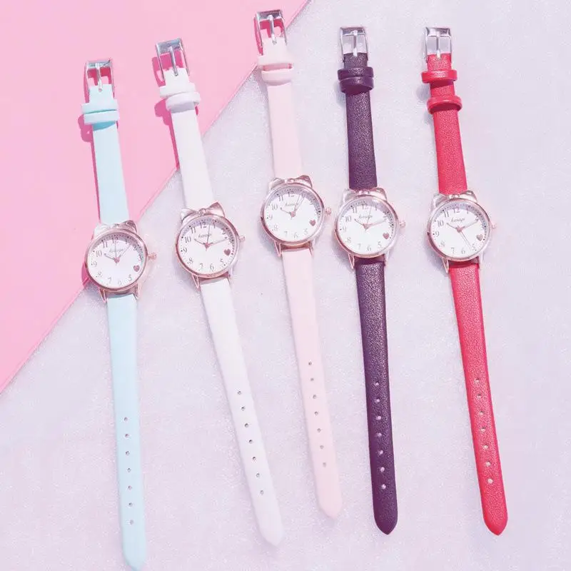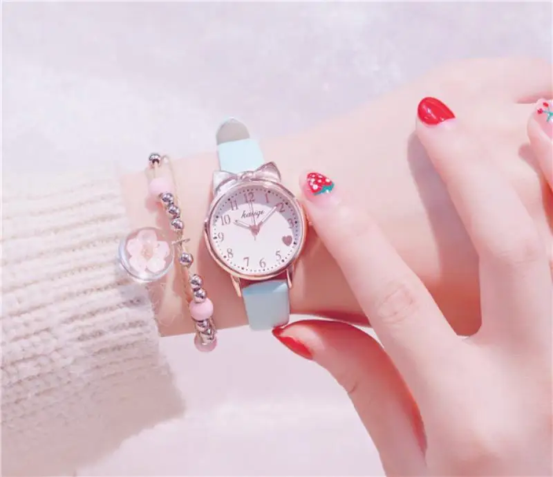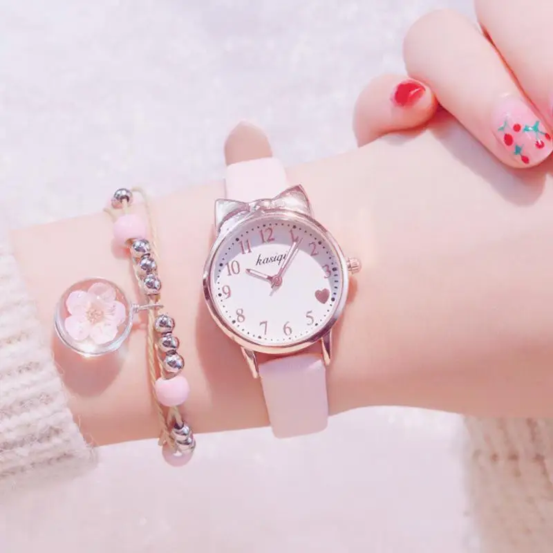 Милые женские часы с кошкой, розовый женский набор часов с кожаными ремешками, простые женские часы с цветком, браслет, Reloj Mujer Montre Femme