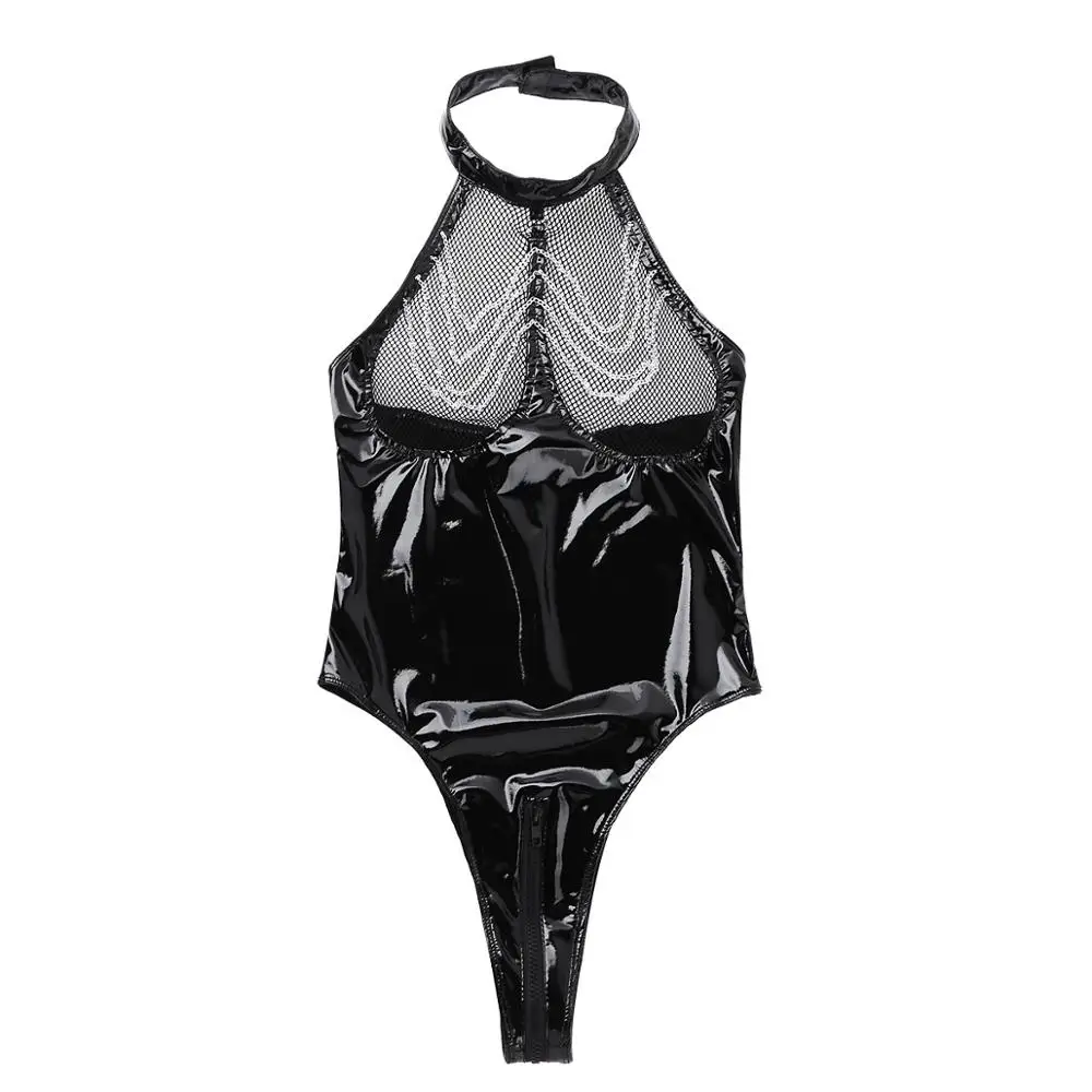Сексуальный искусственная кожа из ПВХ Женский экзотический Цельный купальник на молнии, с сетчатый купальник, без рукавов, с лямкой через шею