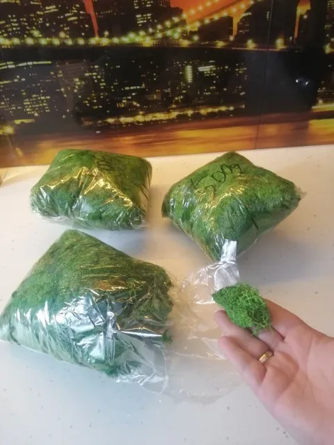 Получили посылку довольно быстро, товар отслеживался. Из плюсов: практически не пахнет, руки не красит, цвет один в один как на фото, на ощупь приятный. Из минусов: зелень очень крошится, 500 грамм товара пришло в 25 пакетах внутри большого пакета, один из пакетиков содержал более темный зелёный оттенок, чем остальная зелень, есть маленькие дефекты на кончиках мха. . В основном, товаром довольны. Первые 3 фото сняты на профессиональный фотоаппарат с соблюдением оттенка, остальные 2 фотографии для визуального восприятия, как выглядит посылка в целом.
