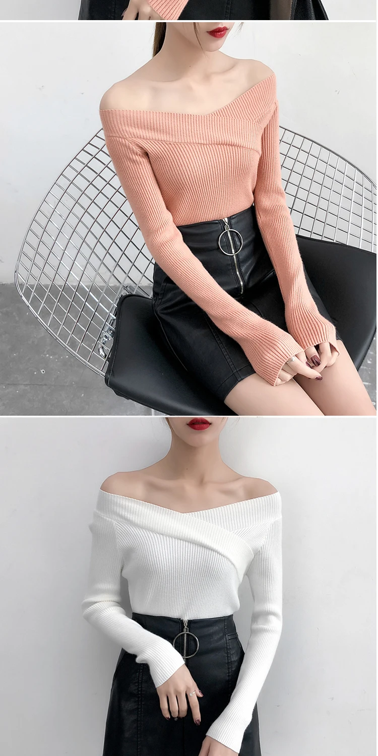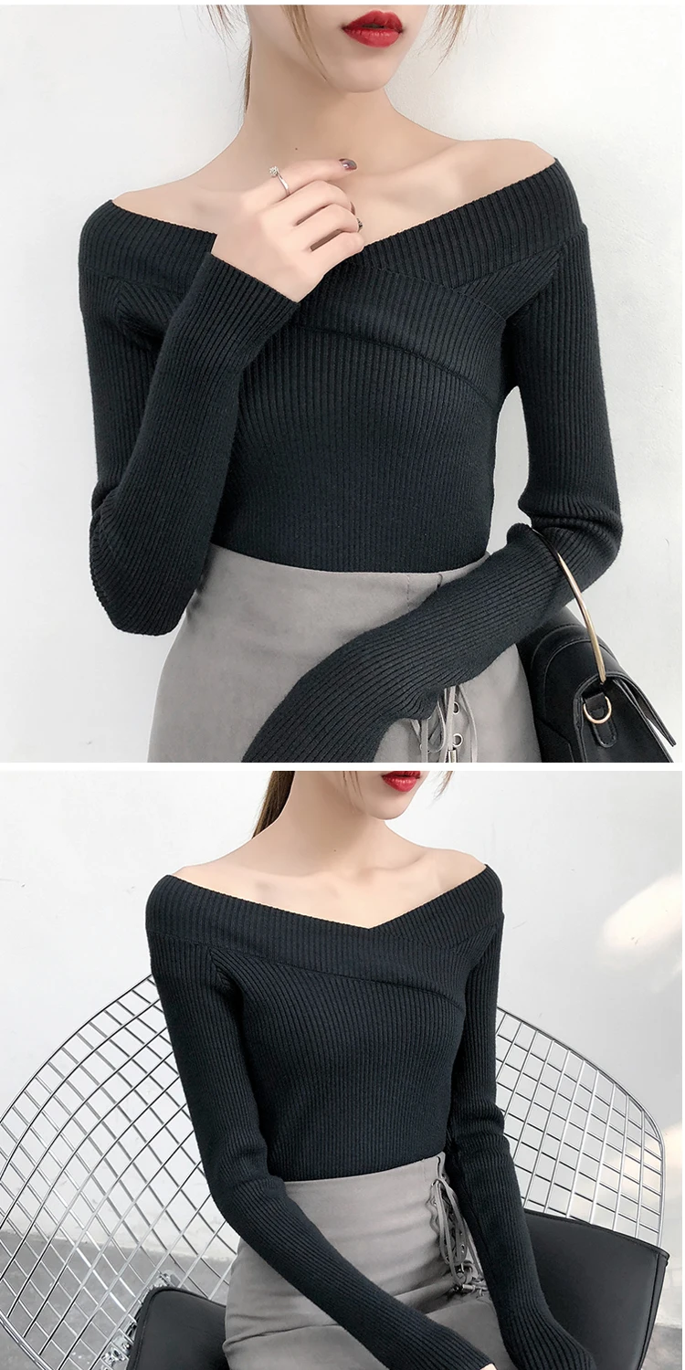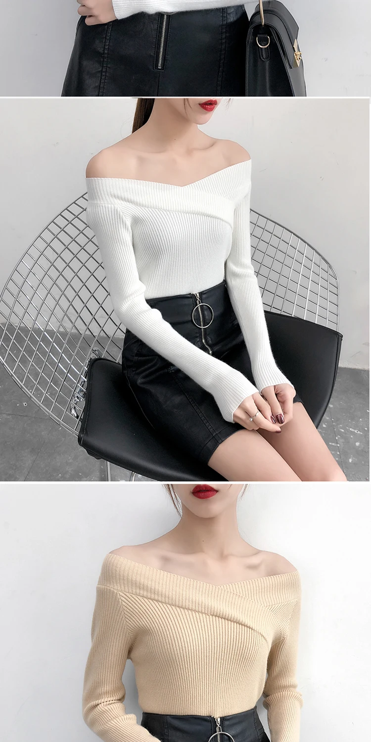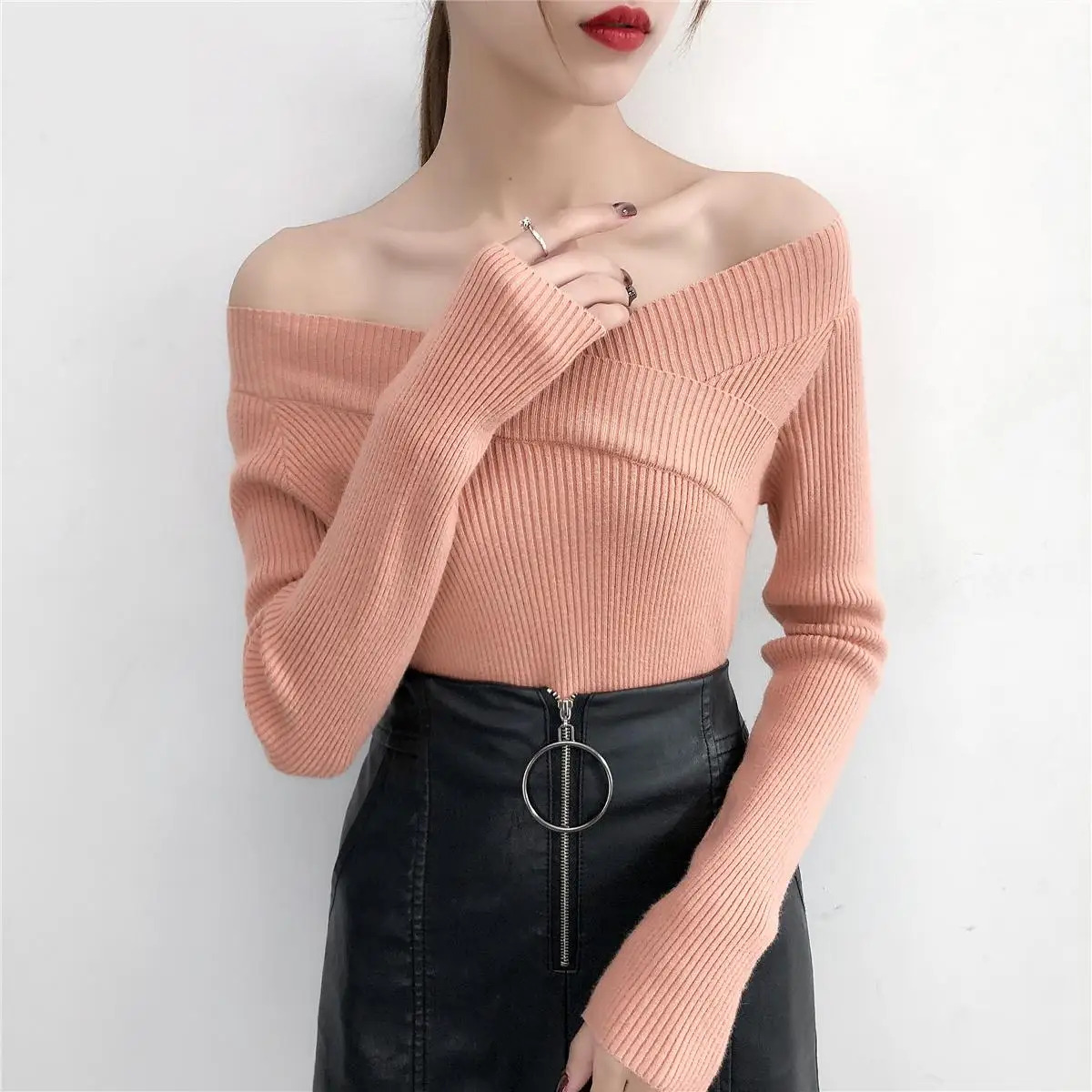 Новые поступления, сексуальные женские трикотажные пуловеры с открытыми плечами, свитеры, сезон осень-зима 2019, женская трикотажная одежда с длинным рукавом, женские топы