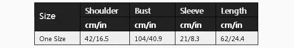 Длина:62 см Таблица размеровРазмеры::Один размерПлечо (см/дюйм)::42/16.5Бюст (см/дюйм)::104/40.9Рукав (см/дюйм)::21/8 образования легкой пены. 3Длина (см/дюйм)::62/24.4