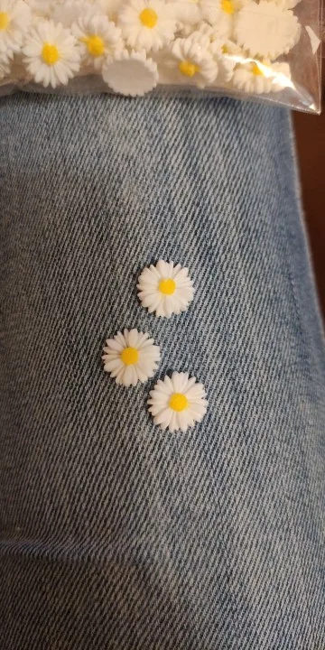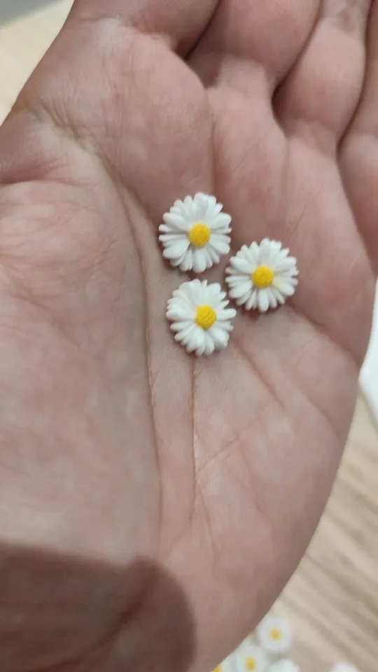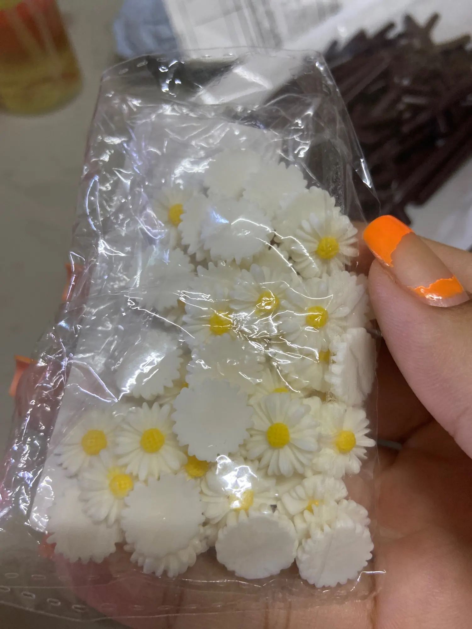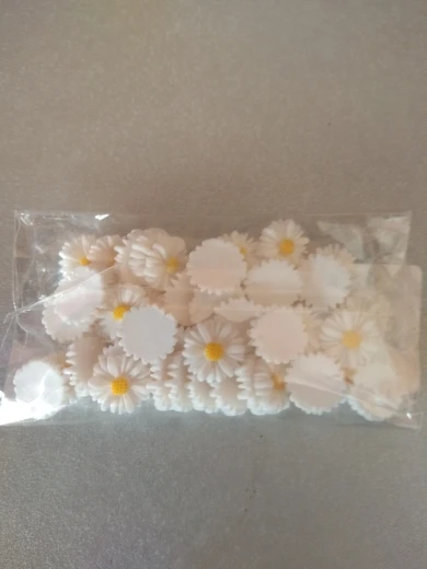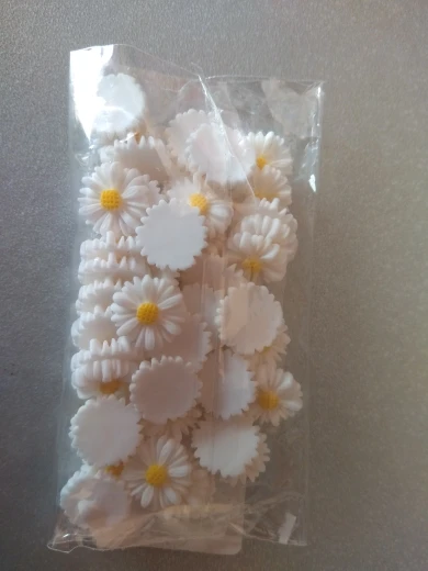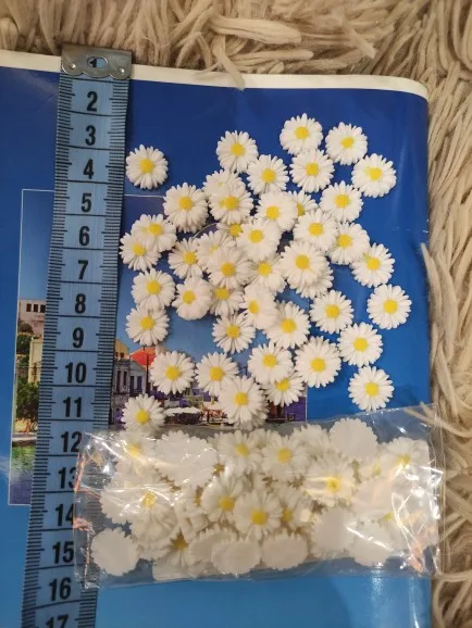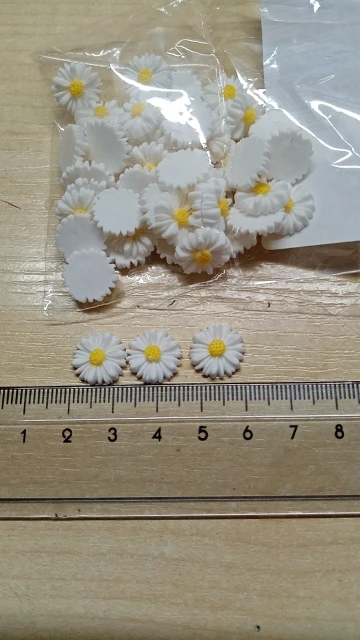 Очаровательные чёткие ромашки, 50 штук, 13 мм. Рекомендую смело, качественный красивый товар. Замечательные, чистый белый цвет, яркие жёлтые серединки, всё как положено ромашкам, я довольна, отверстия нет, придётся сверлить, цветочки сплошные. немного пахнут ацетатно, но если их положить в открытый лоток, запах вскоре выветривается, я постоянно так делаю с новыми цветочками. Благодарю, уважаемый продавец, всех благ вам и процветания вашему бизнесу.
