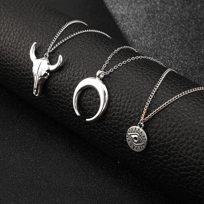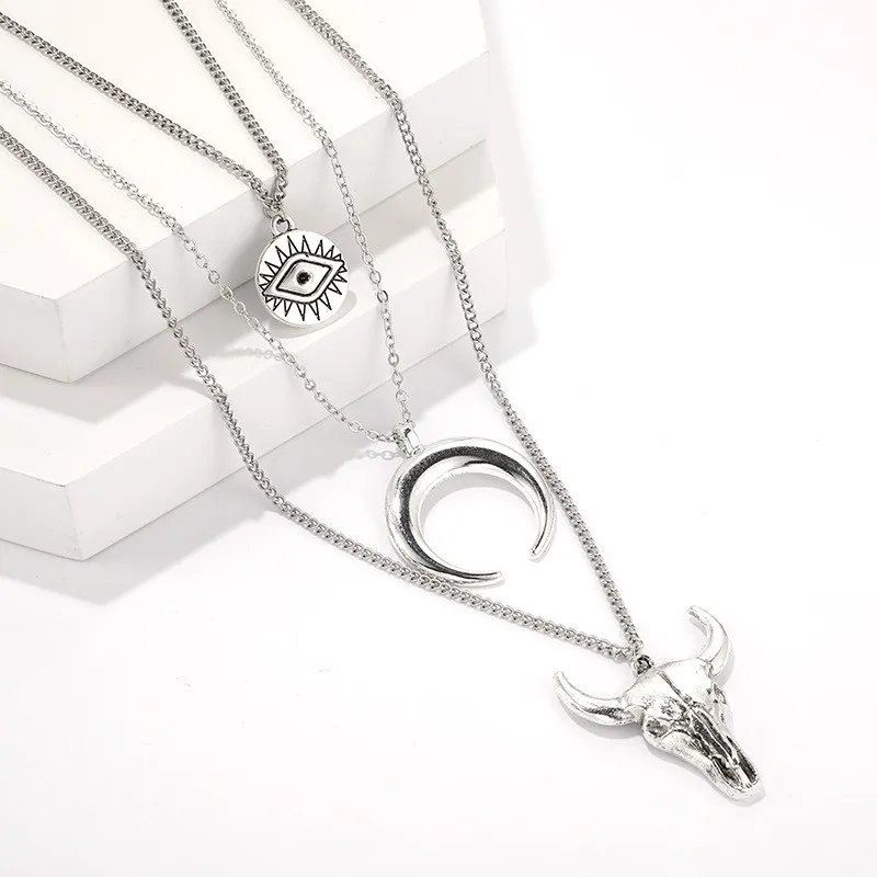 Цепочка с подвеской в богемном стиле Женская, многослойное Ювелирное Украшение из сплава с головой быка, Луной и Серебристый Овальный