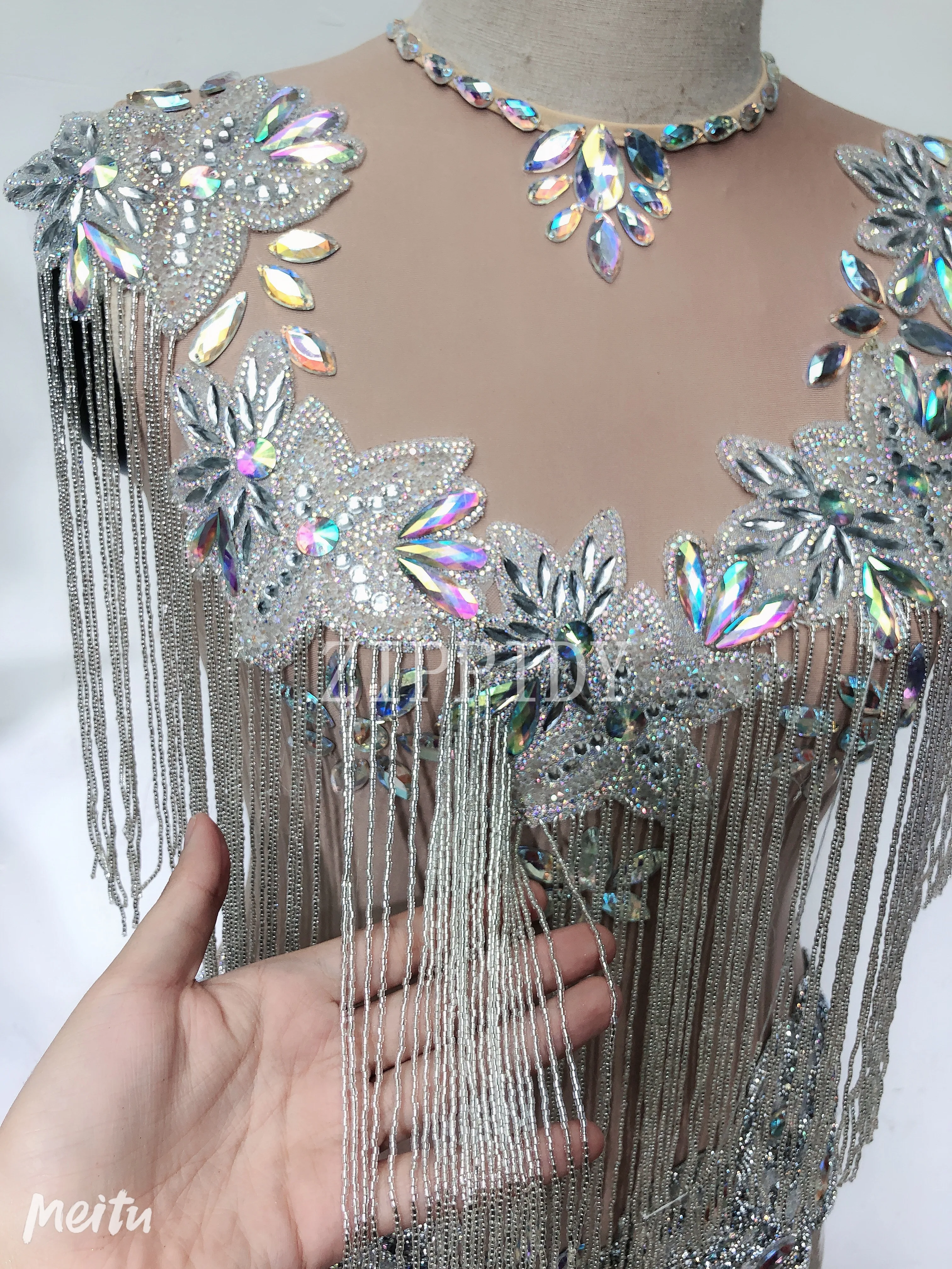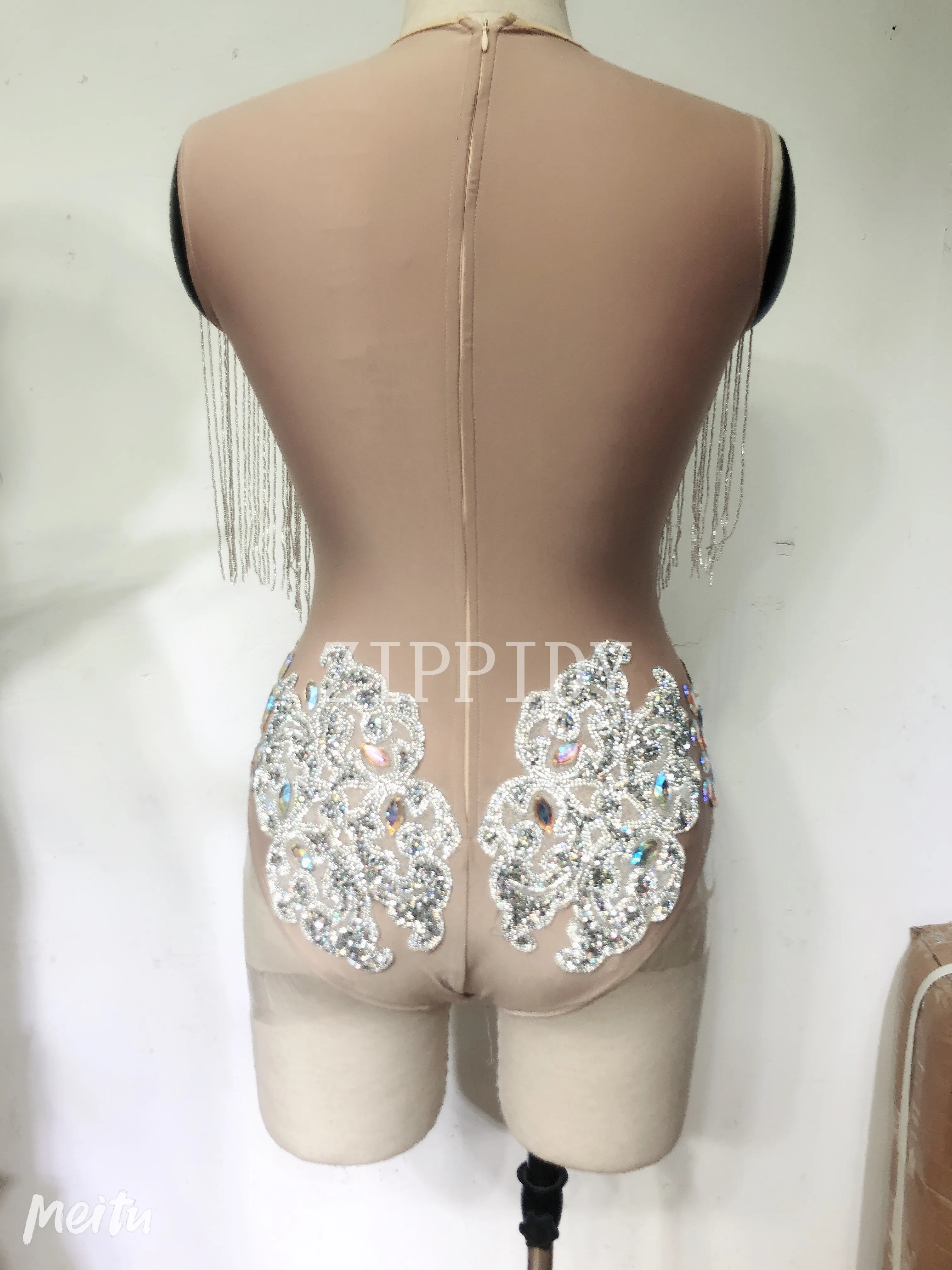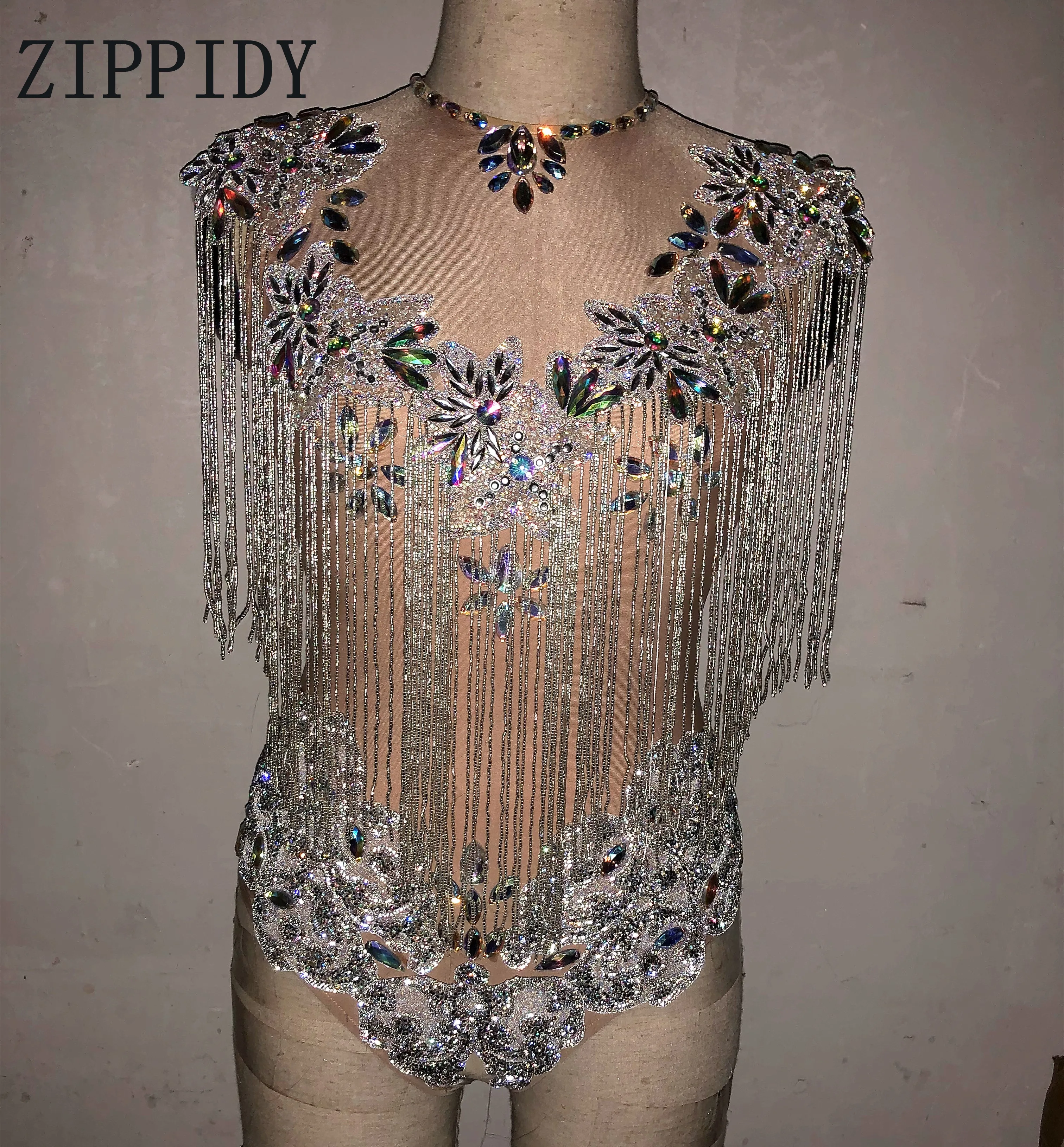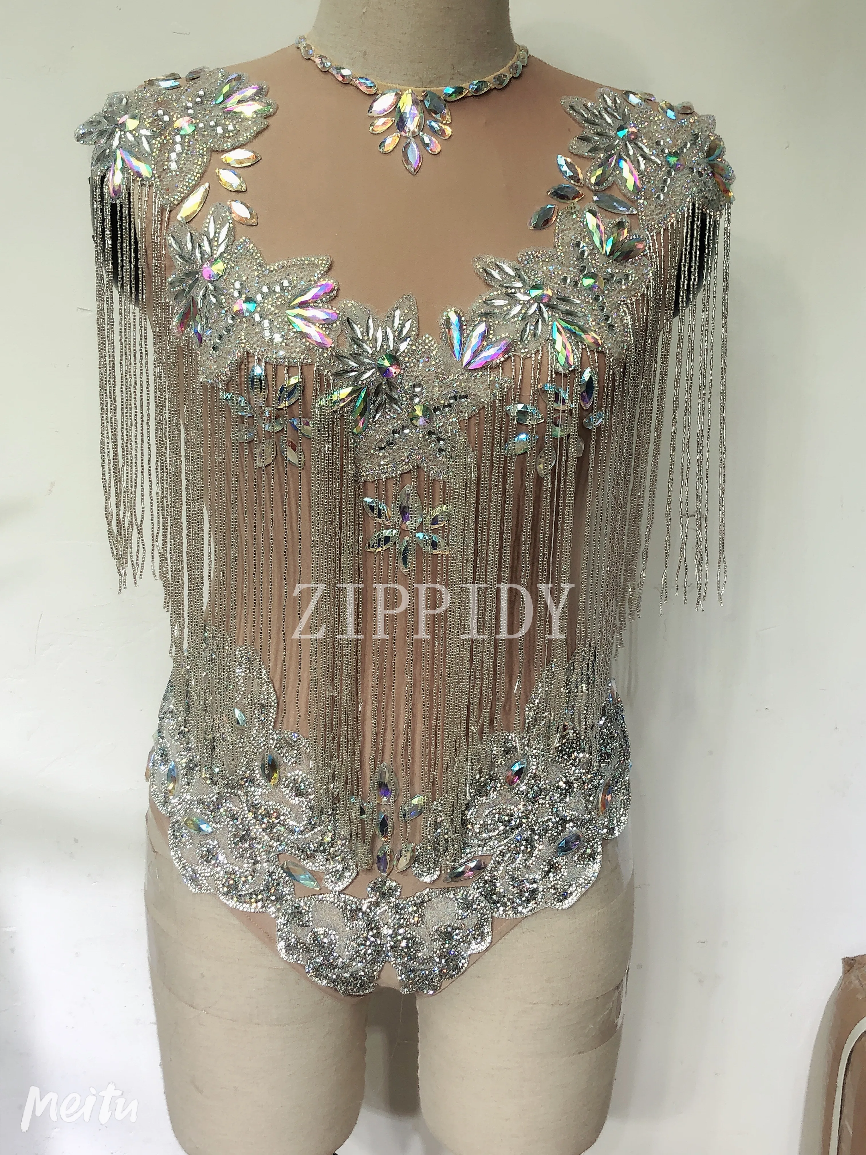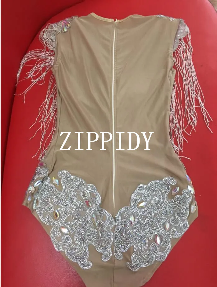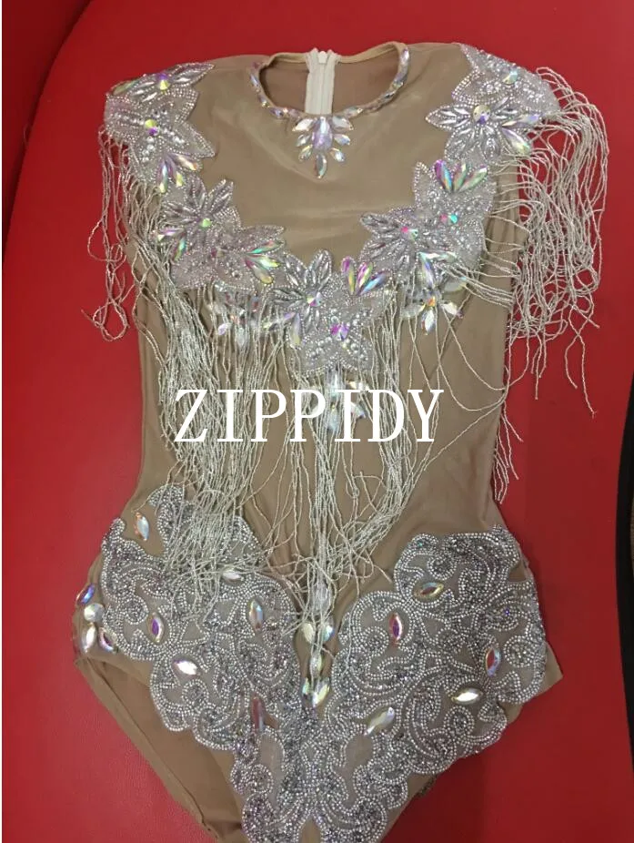 Сияющие AB Камни бахрома трико телесного цвета цельный с кисточками боди Вечеринка День Рождения Праздновать костюм певица танец стрейч наряд