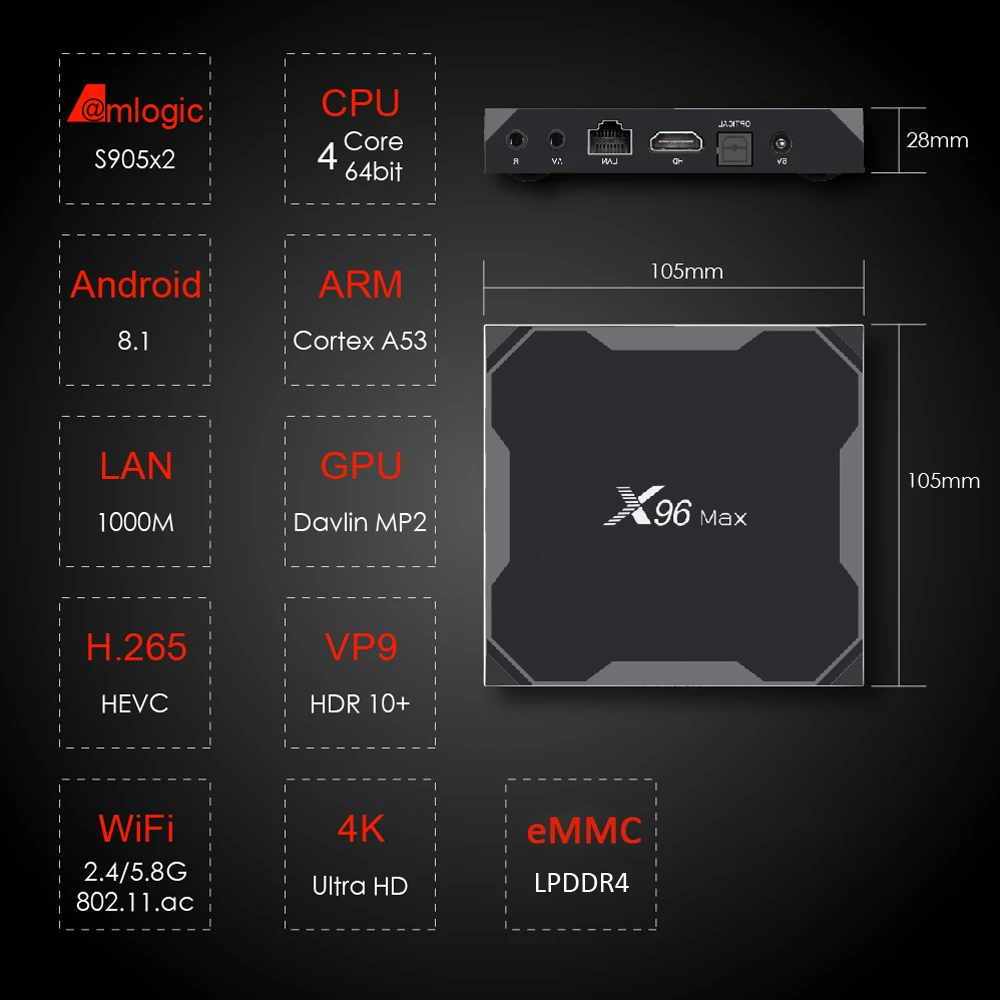 Приставка Смарт-ТВ X96 MAX, Android 8,1, 2 + 16 ГБ, Amlogic S905X2, 2,45,8 ГГц