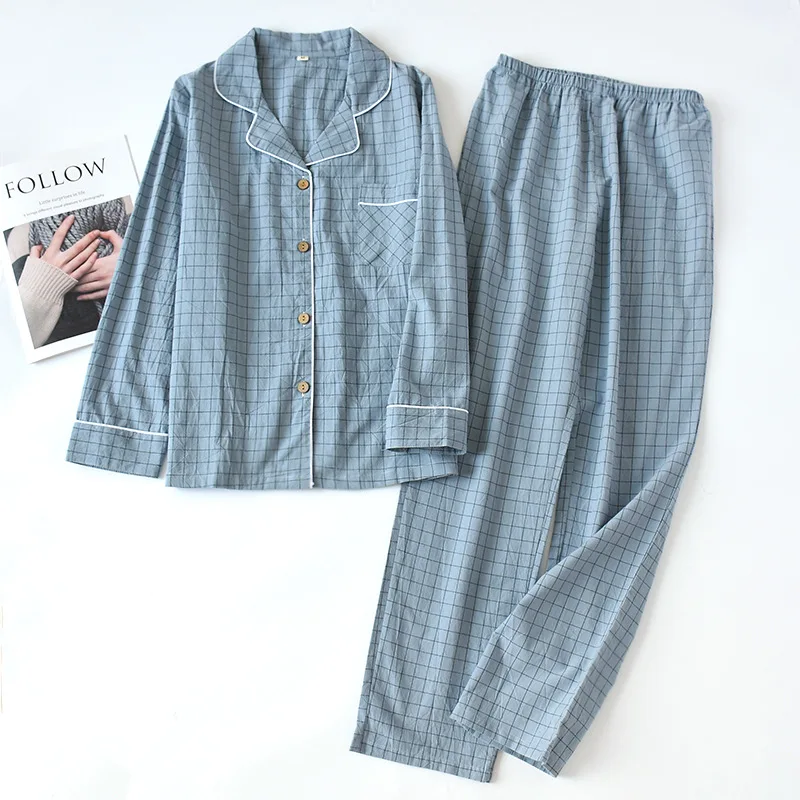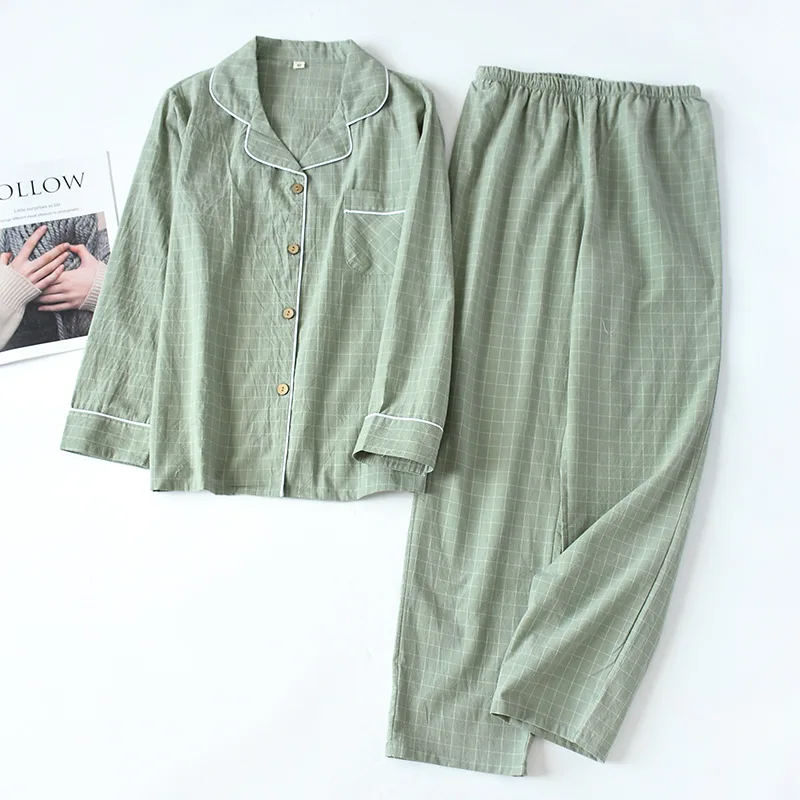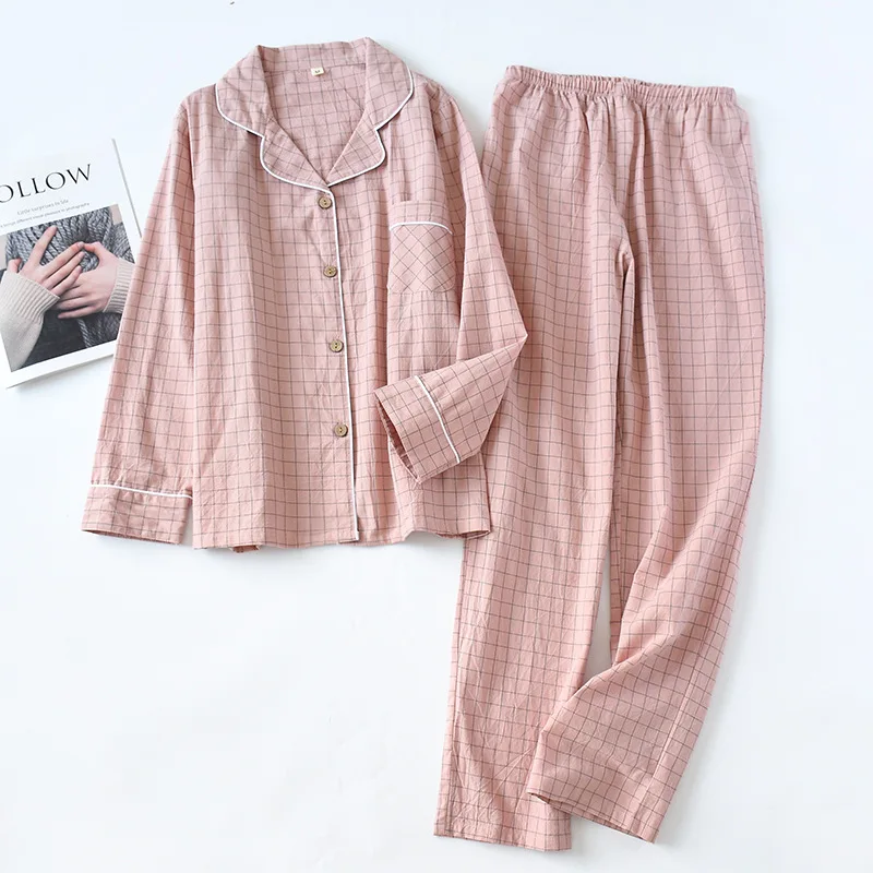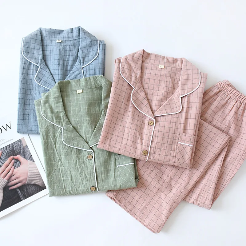Пижама женская из чистого хлопка, с длинным рукавом и отворотом, осень Пижама клетчатая