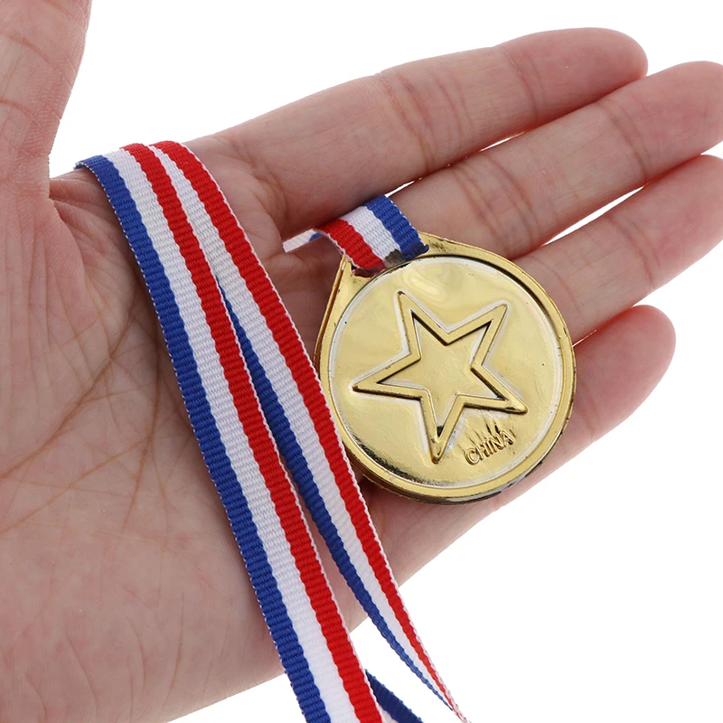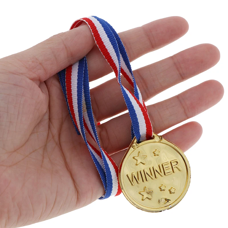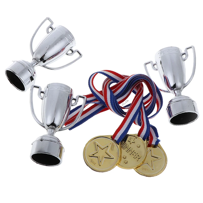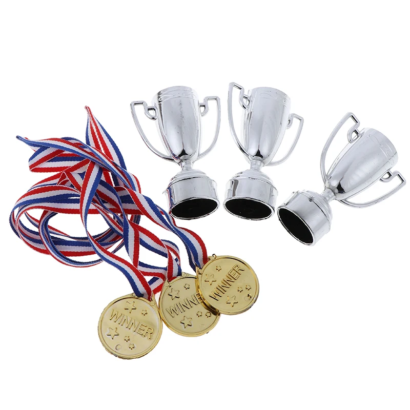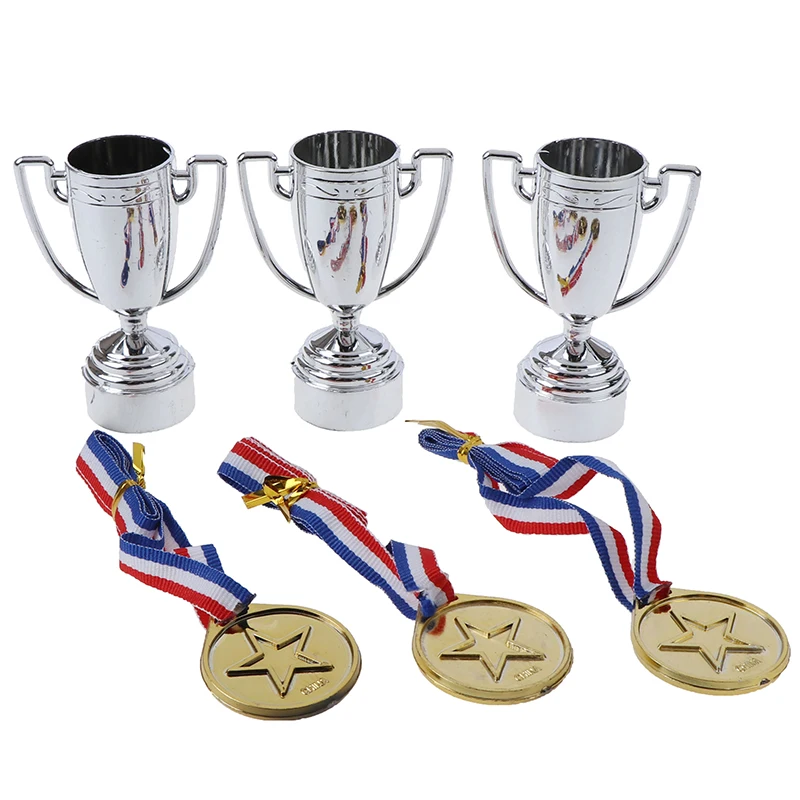 6 шт. = 3 шт. Золотые пластиковые медали победителей + 3 пластиковых трофей, игрушки для детей, веселые реквизиты для детской вечеринки