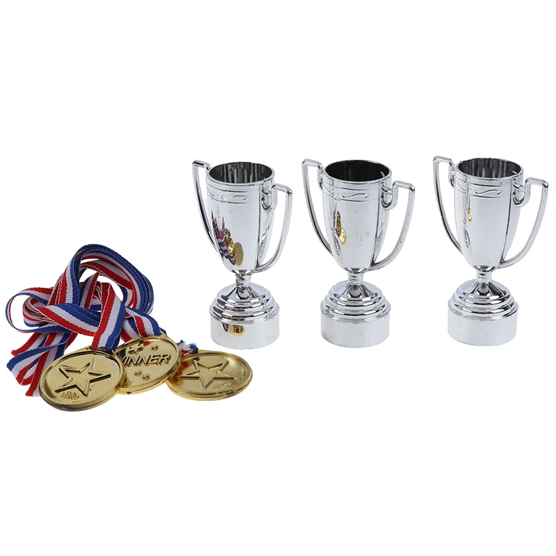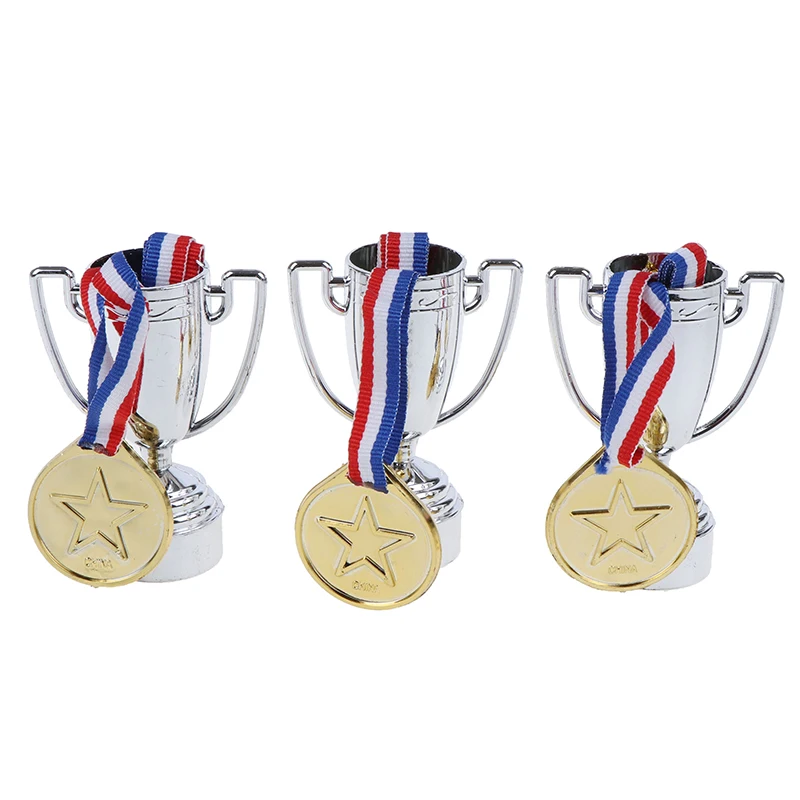 6 шт. = 3 шт. Золотые пластиковые медали победителей + 3 пластиковых трофей, игрушки для детей, веселые реквизиты для детской вечеринки