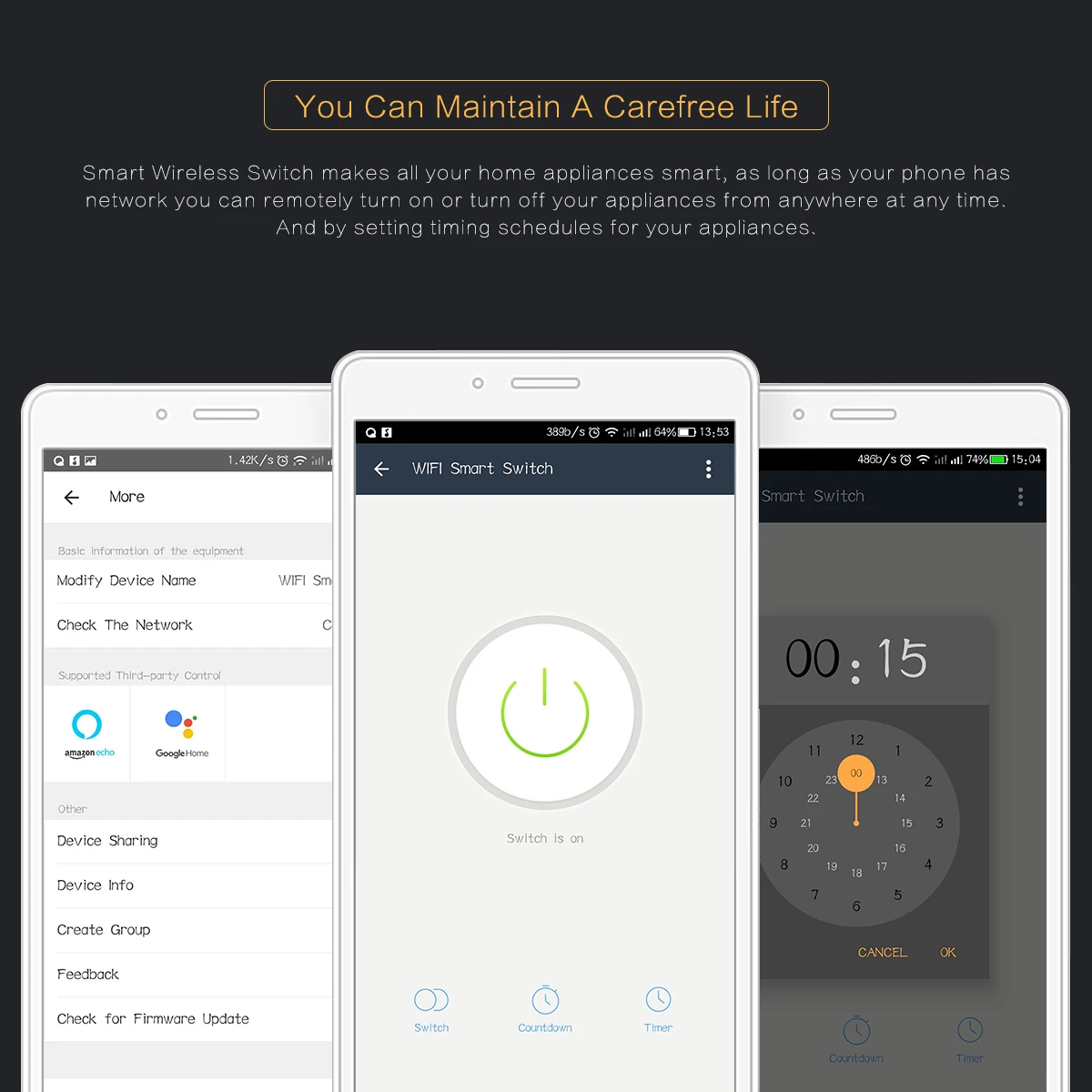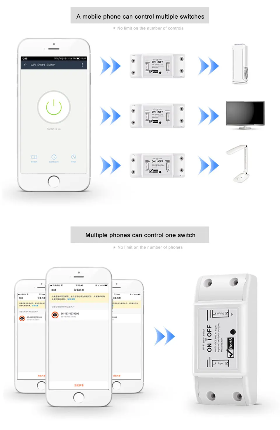 Этот продуктЭто недорогое и доступное устройство, которое поможет вам войти в удивительный умный дом. Это беспроводной переключатель Wi-Fi, который может подключаться к прибору различных типов и брендов.ПродуктОтправляет данные на облачную платформу через Wi-Fi роутер, который позволяет удаленно управлять всеми устройствами с помощью приложения eWeLink на вашем смартфоне.ПродуктДелает все ваши бытовые приборы умными, если ваш телефон имеет сеть, вы можете удаленно включить или выключить ваши приборы из любого места в любое время. И установив графики для ваших приборов, вы можете поддерживать беззаботный срок службы.