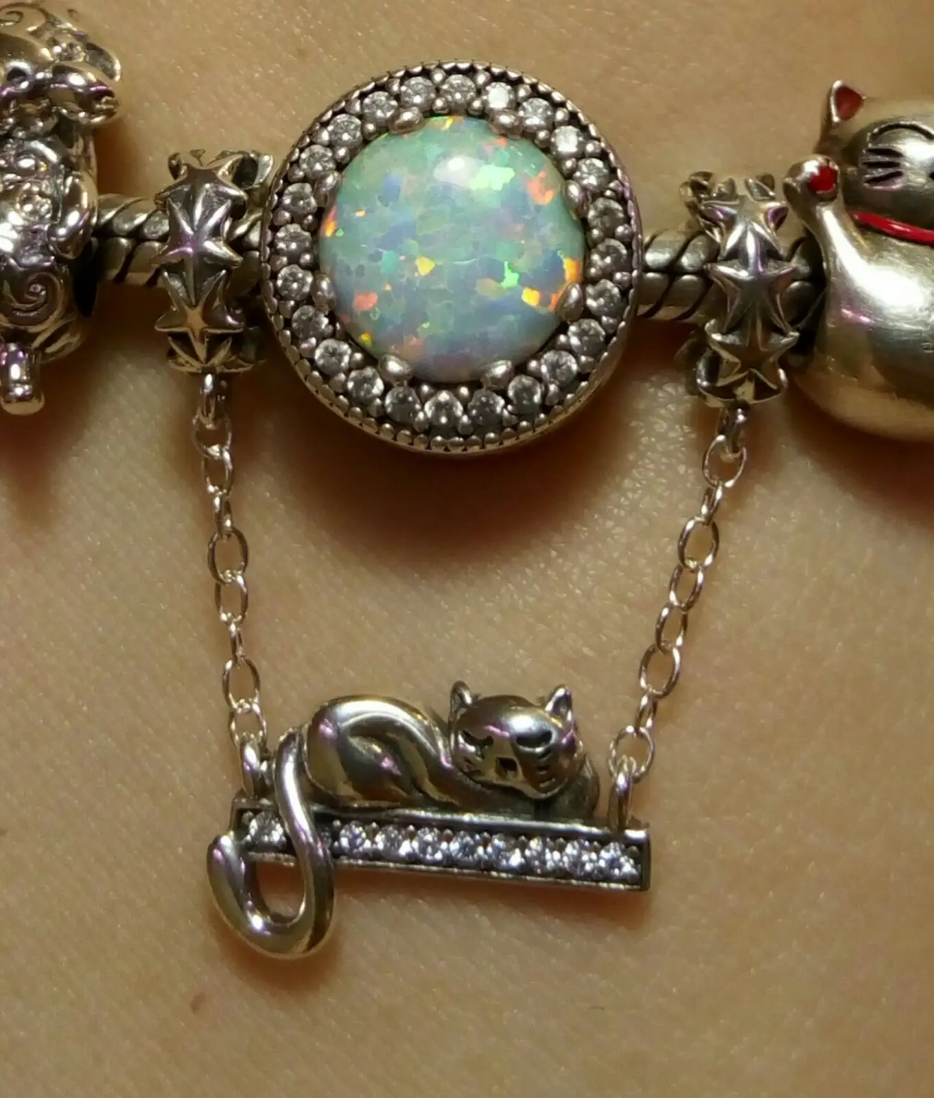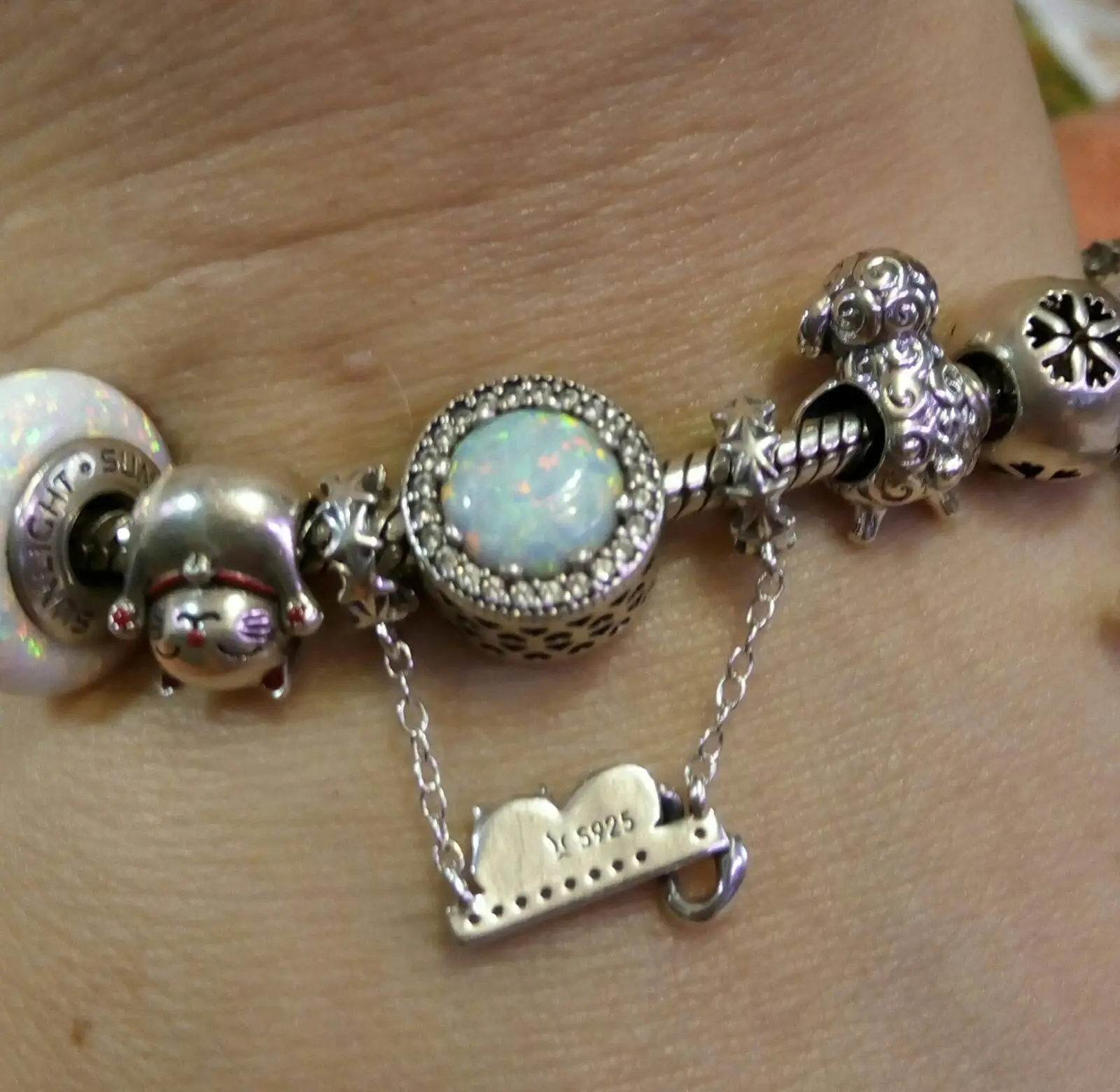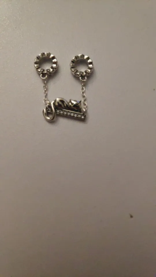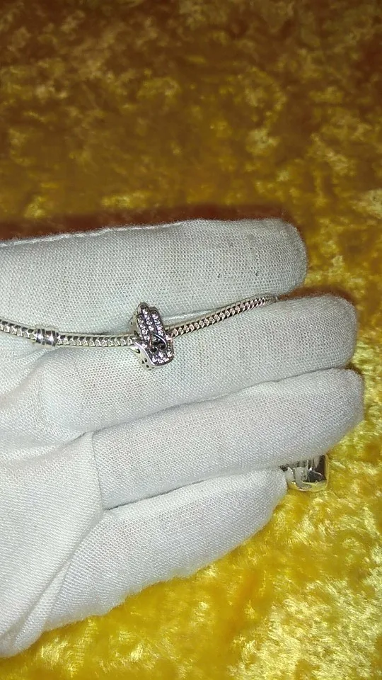Шарм красивый. Очень тонкий плоский, я думала - он пообъемнее. Это не стоппер с цепочками. Браслет не удержит от раскрытия и того, что бусины рассыплются. Это именно шарм. На мой вкус хорошо смотрится с какой ни-будь плоской бусиной посередине. На браслет Пандора налез без проблем, резьбы нет. Посылка шла 3 недели.