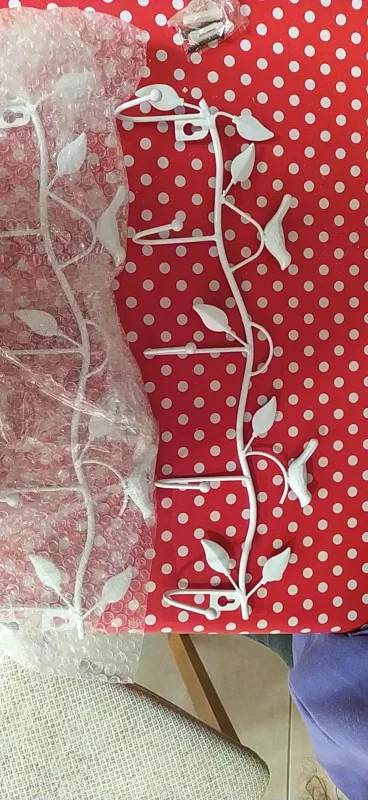 Вешалка как на картинке, упакована была в пупырку, но все равно некоторые листики помялись. Основание у вешалки не прямое, отверстия, на которые предполагается вешалку крепить не параллельны стене. Надеюсь, что когда к стене прикрутится, то выровняется.