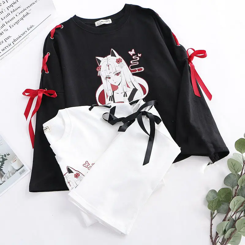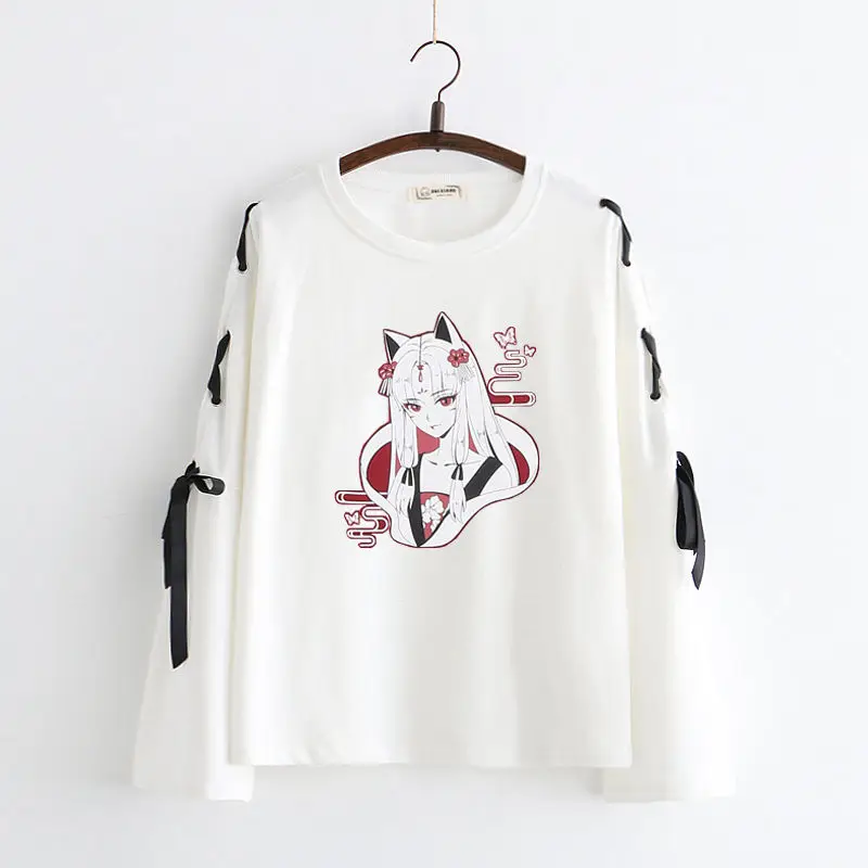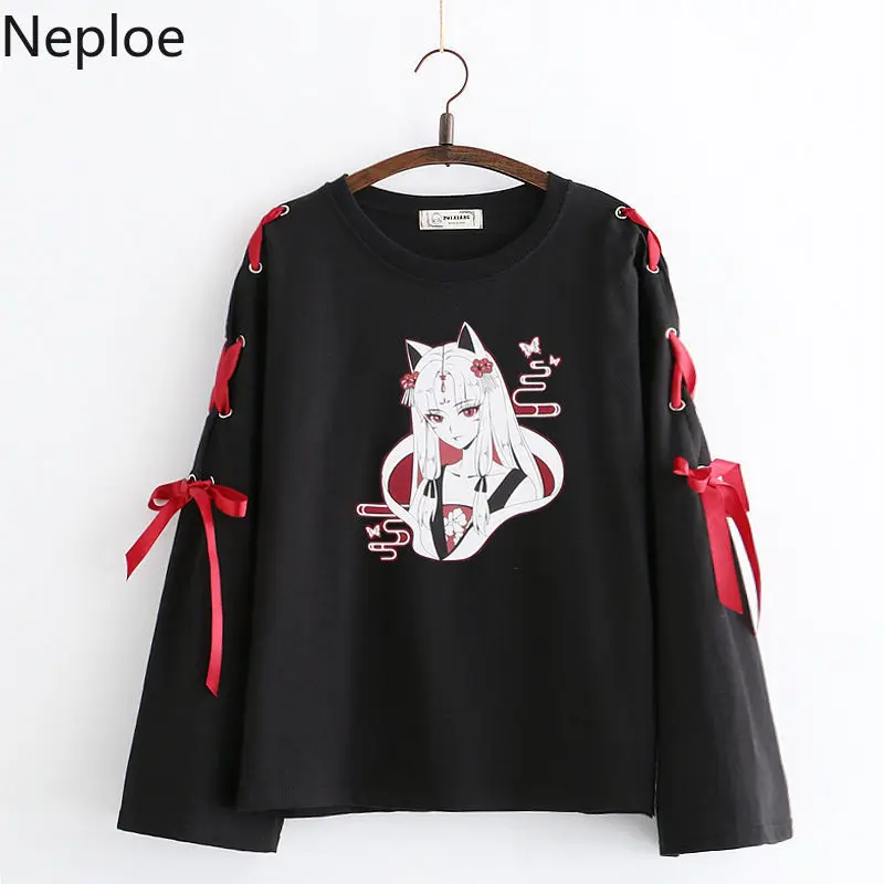 Neploe Осенняя японская футболка с длинным рукавом Футболка с мультяшным принтом в стиле Харадзюку, облегающие футболки с перекрестным бантом, белые черные топы 54300