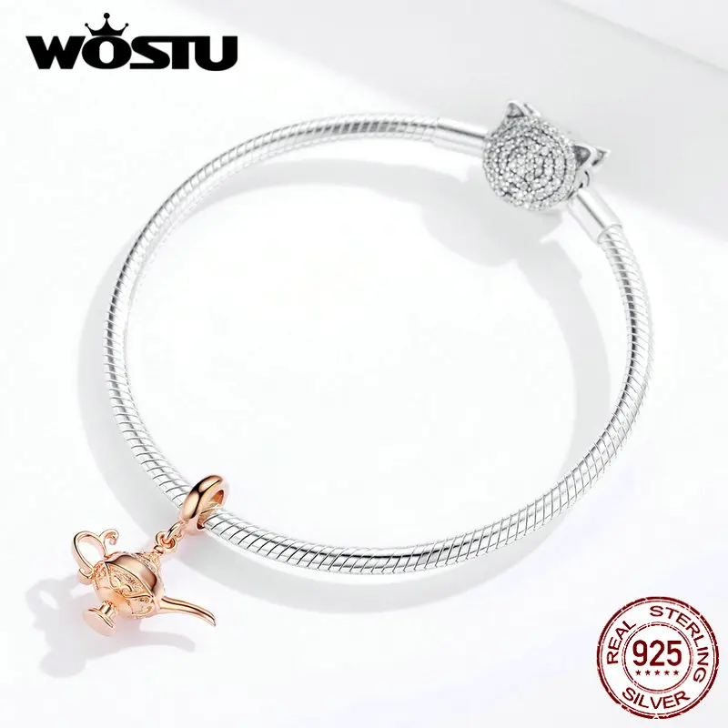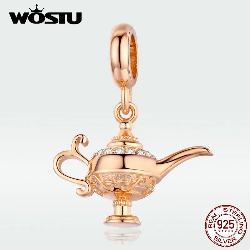Шарм WOSTU из настоящего серебра 925 пробы в виде лампы Аладдина, бусины из розового золота, оригинальный кулон для браслета, ювелирные изделия с пожеланиями на удачу, CQC703-C