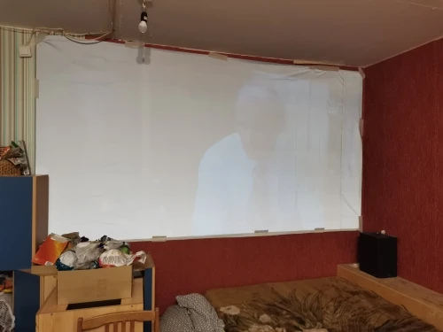 Брал полотно за 650 р со скидками и купонами на 72 дюйма. До покупки висела простыня, теперь картинка стала четкой и сочной. Да, смотреть по бокам плохо, темнеет изображение. Днём тоже не комфортно, только ночью. Можно конечно в тканях поискать и дешевле такую- за 3м 500 р. Но не нашёл. В общем хорошая вещь!