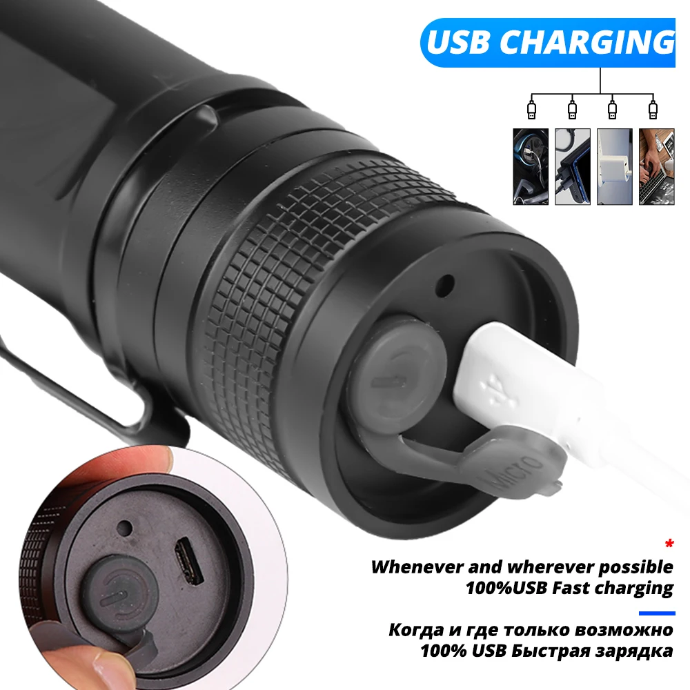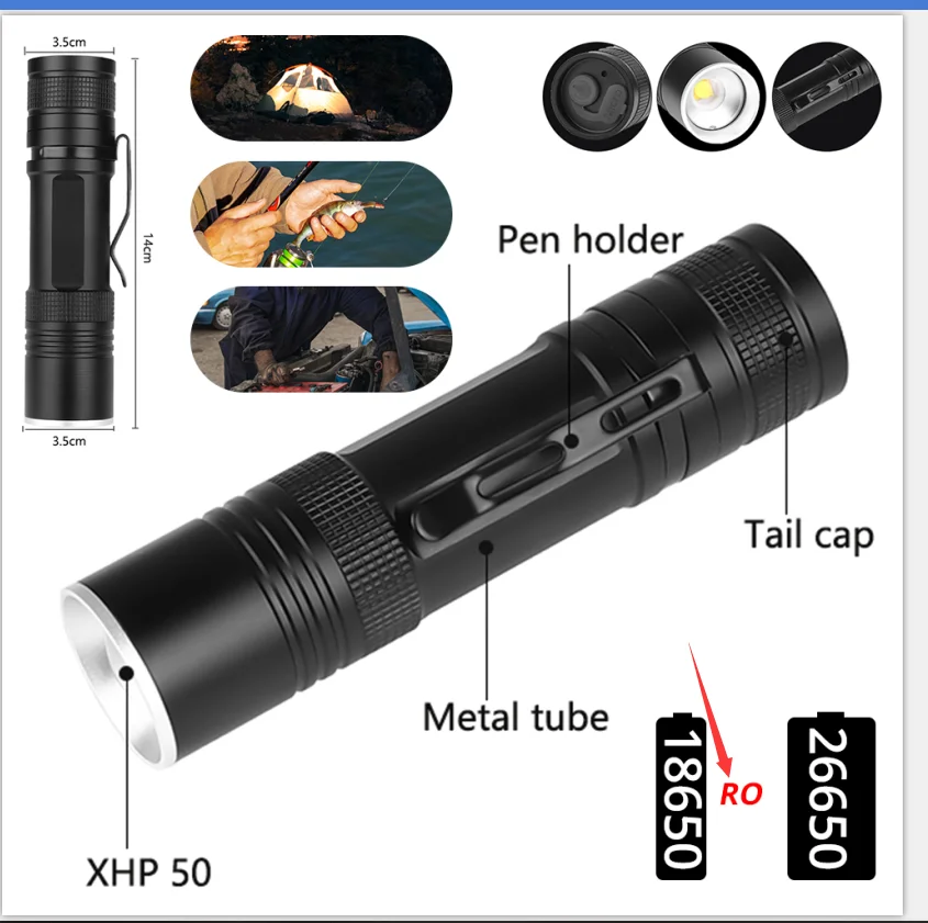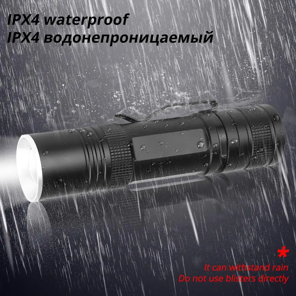 Увеличьте 1*18650 или 1*26650 аккумуляторный отсек, чтобы увеличить время работы.Дисплей емкости аккумулятора, телескопический зумМикро-usb для компьютера usb, Автомобильный USB, usb-разъем для зарядки, зарядный фонарикИзготовлен из авиационного алюминиевого сплава прочный HAIII военный класс Жесткий анодированныйВодонепроницаемый в соответствии с IPX-6, водостойкий, может использоваться в дождливую погоду, но не может положить его в водуПодходит для работы, охоты, альпинизма, рыбалки, кемпинга и активного отдыха и т. д.Ударопрочный до 2 метров