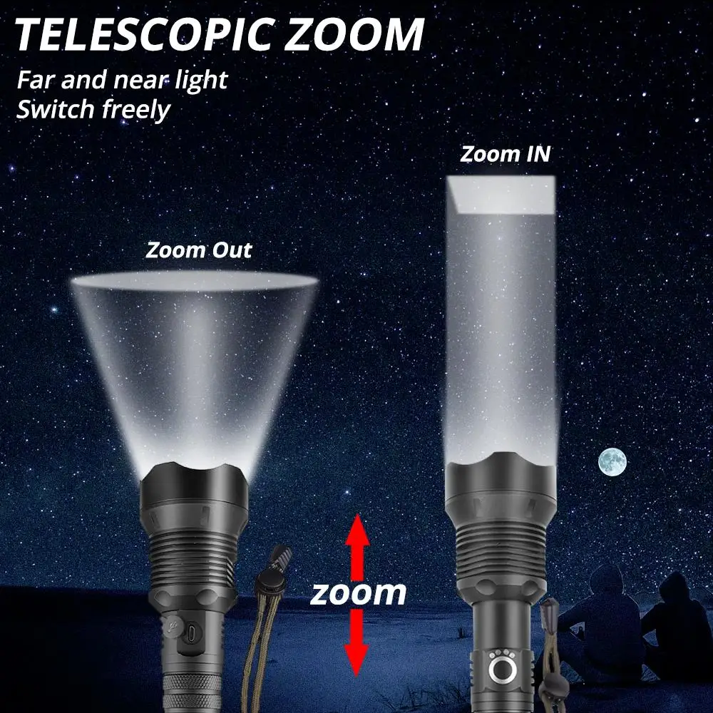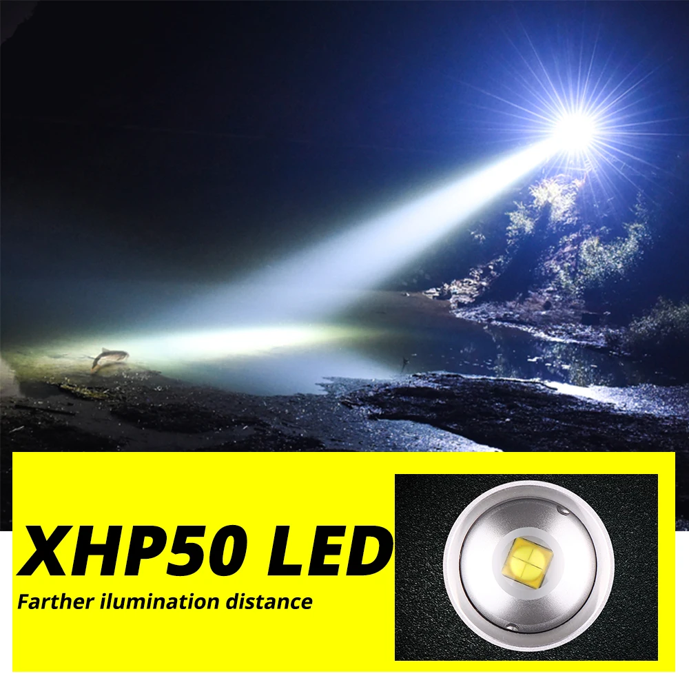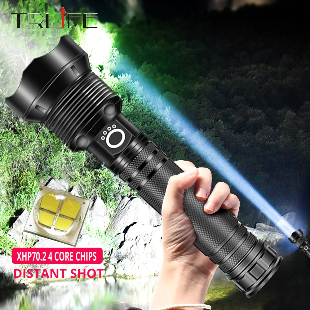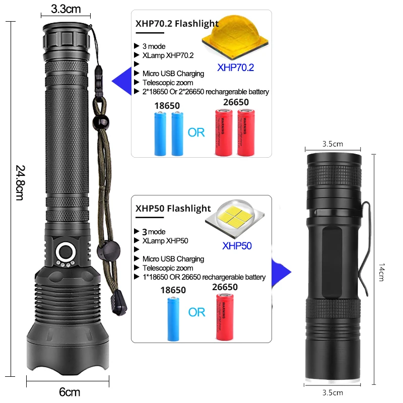 Мощный светодиодный фонарик для использования XHP70.2 светодиодный фонарь для кемпинга на открытом воздухеУвеличьте 2*18650 или 2*26650 аккумуляторный отсек, чтобы увеличить время работы.Дисплей емкости аккумулятора, телескопический зумМикро-usb для компьютера usb, Автомобильный USB, usb-разъем для зарядки, зарядный фонарикИзготовлен из авиационного алюминиевого сплава прочный HAIII военный класс Жесткий анодированныйВодонепроницаемый в соответствии с IPX-6, водостойкий, может использоваться в дождливую погоду, но не может положить его в водуПодходит для работы, охоты, альпинизма, рыбалки, кемпинга и активного отдыха и т. д.Ударопрочный до 2 метров