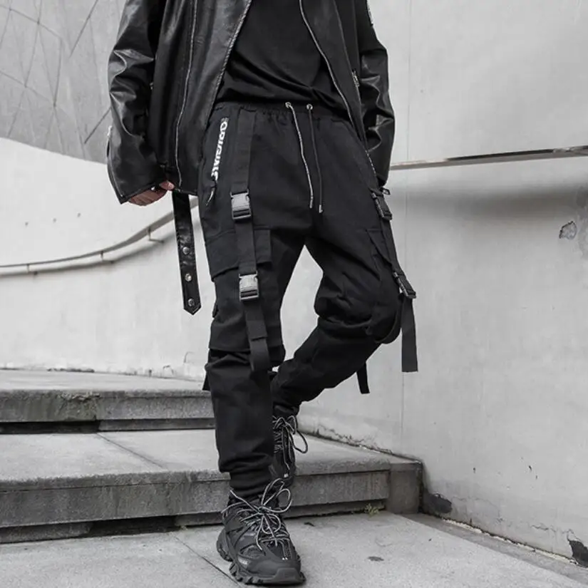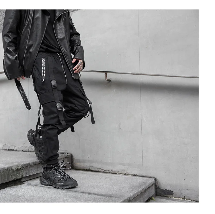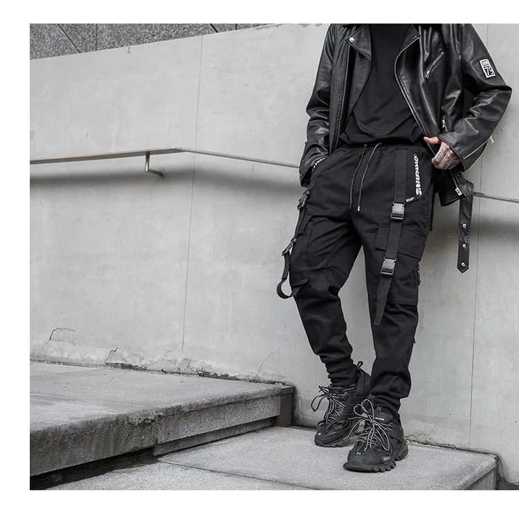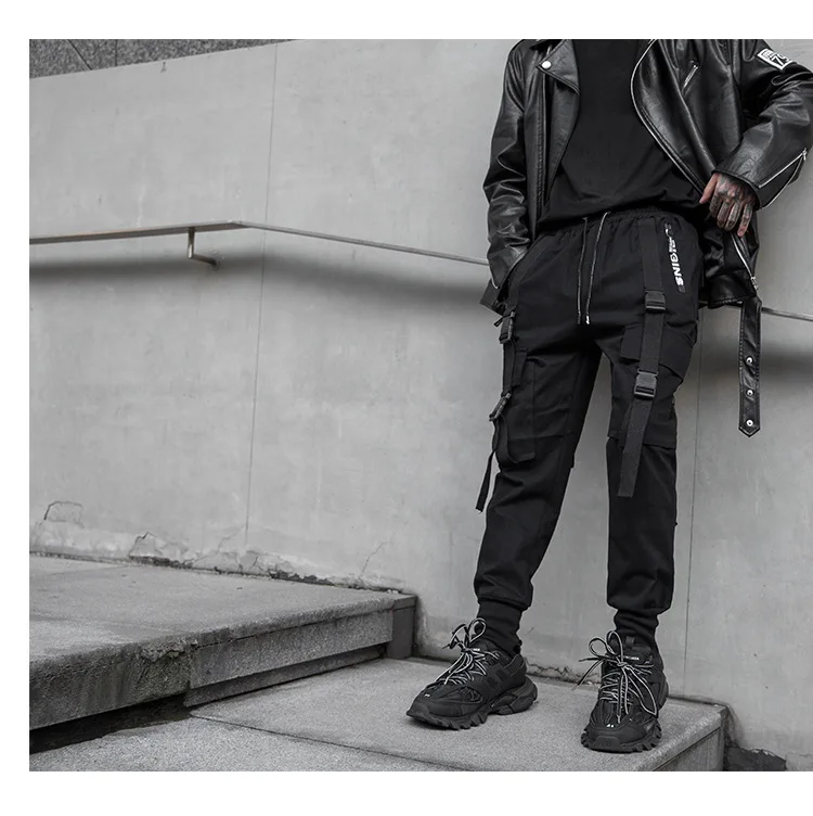 Брюки-карго мужские с лентами и множеством карманов, уличные штаны в стиле хип-хоп, Джоггеры в стиле панк, повседневные спортивные штаны с эластичным поясом, Прямая поставка