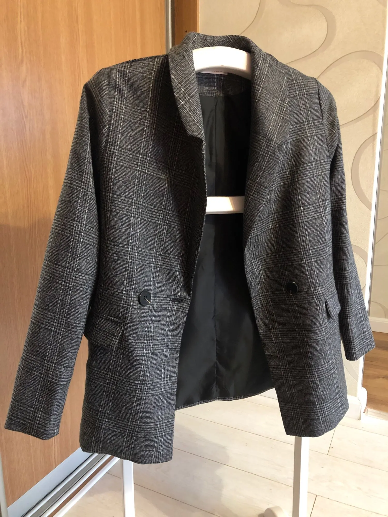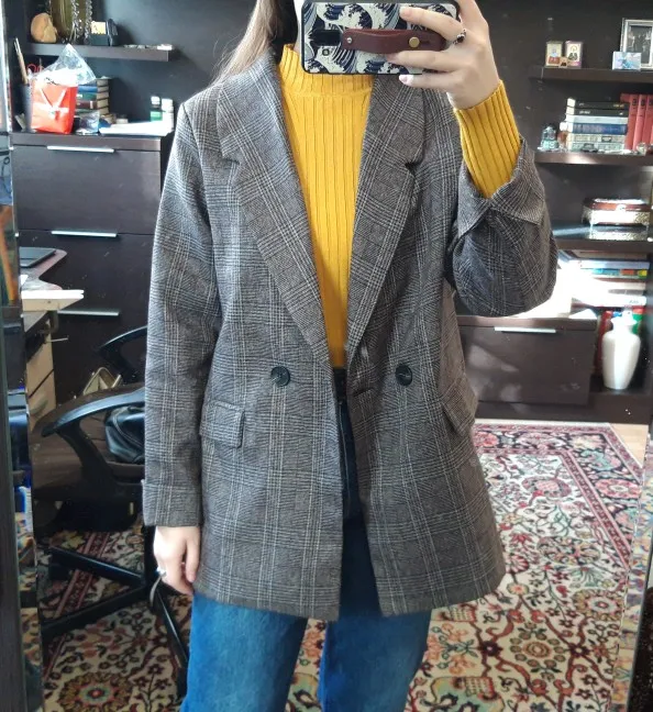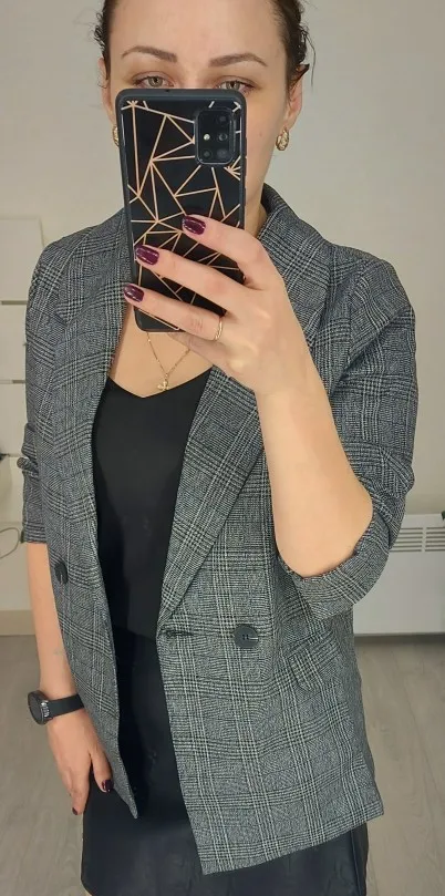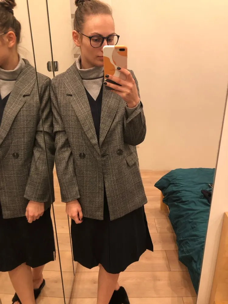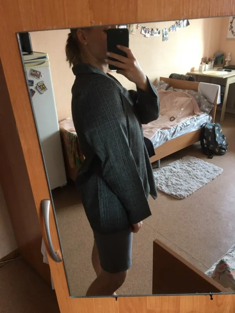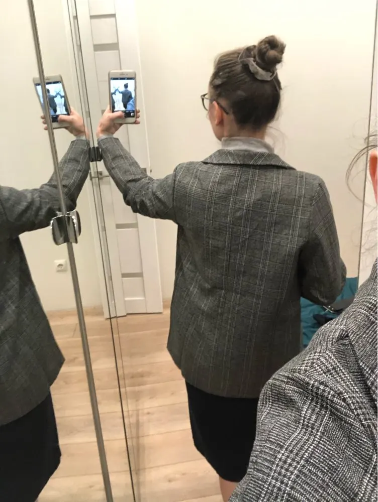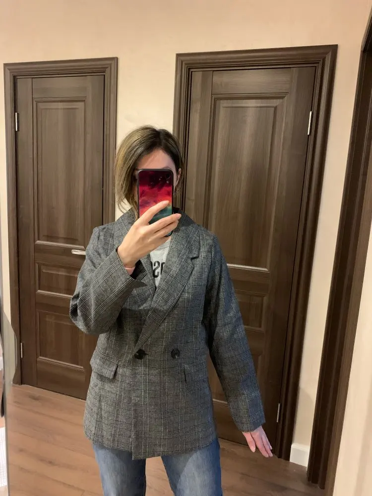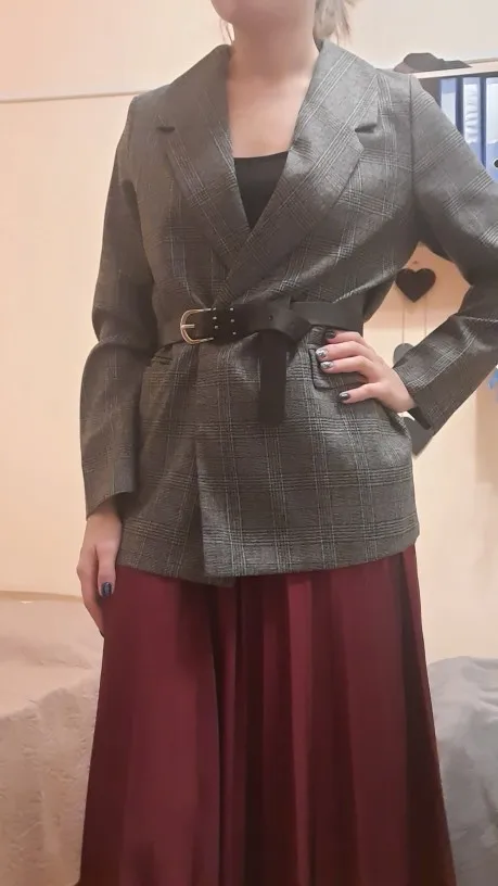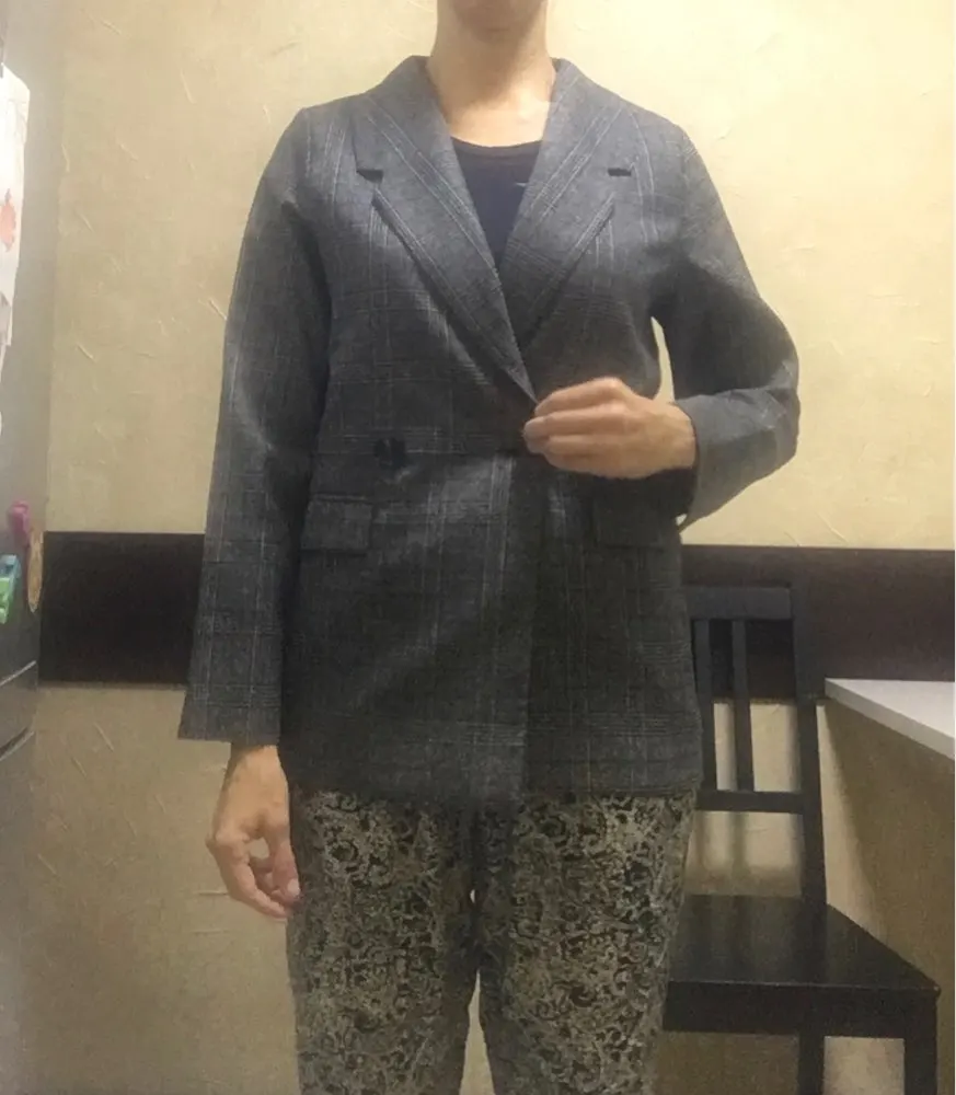 ОГОНЬ! Первый блейзер, который мне понравился! Хорошо сел в плечах, скрыл «недостатки» бедер, ровно и красиво вытянул силуэт строгой вертикальной линией. Спасибо продавцу!