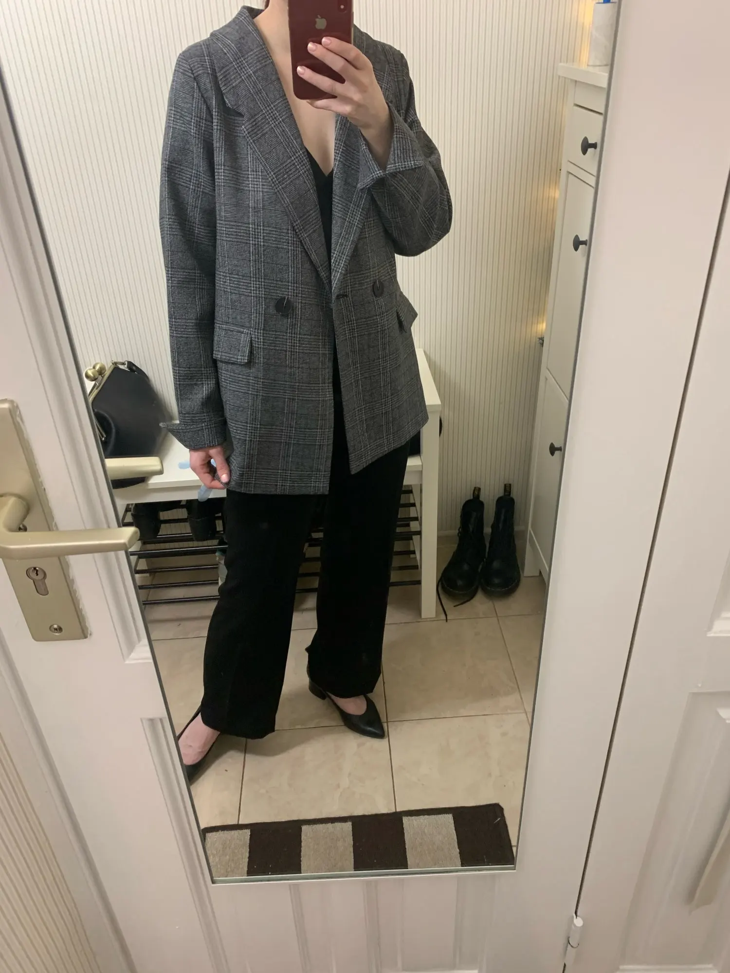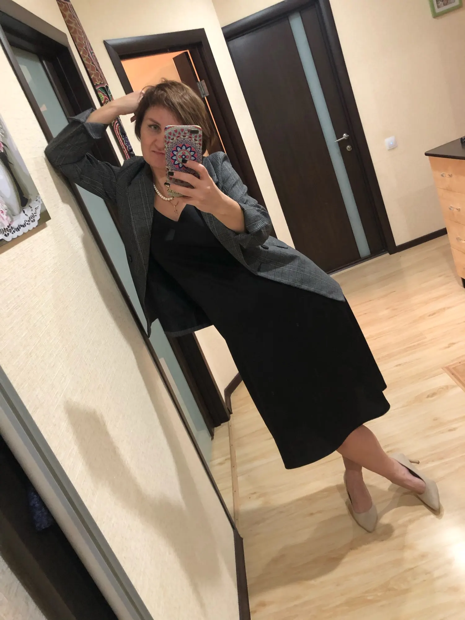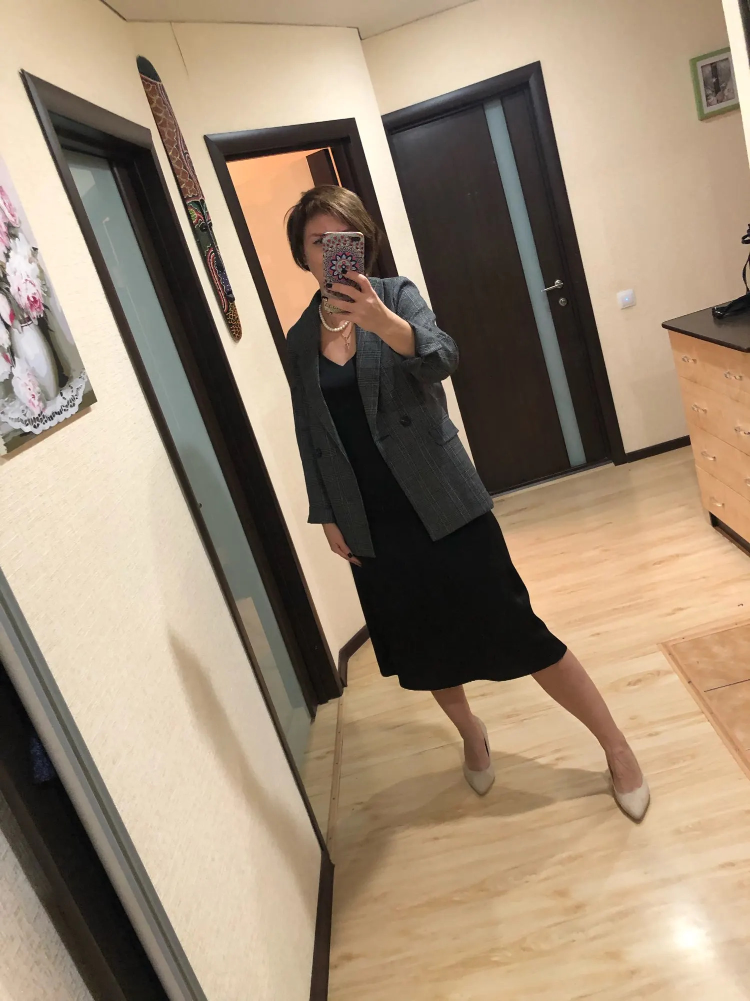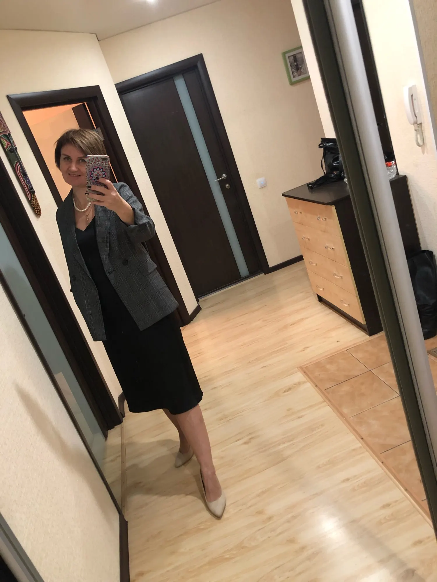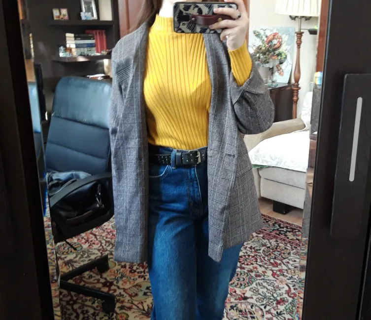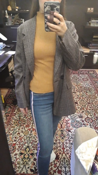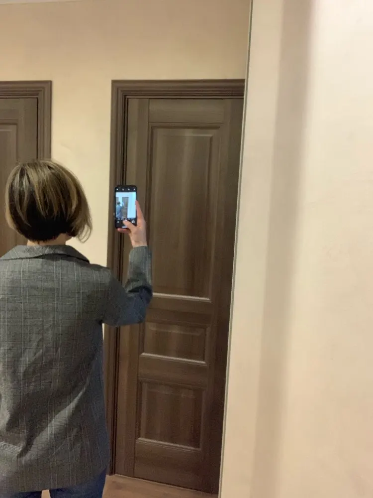 ОГОНЬ! Первый блейзер, который мне понравился! Хорошо сел в плечах, скрыл «недостатки» бедер, ровно и красиво вытянул силуэт строгой вертикальной линией. Спасибо продавцу!