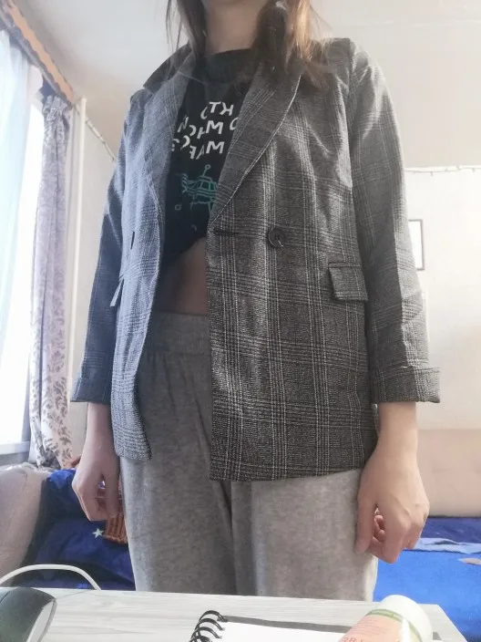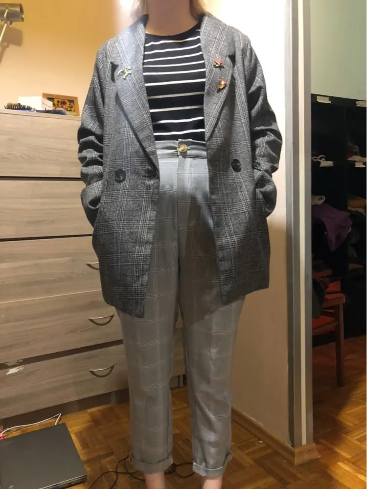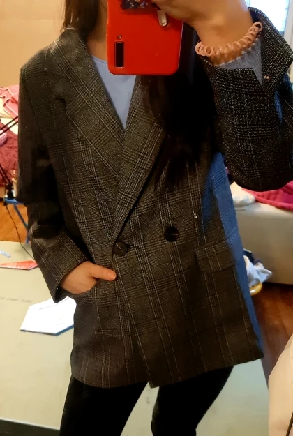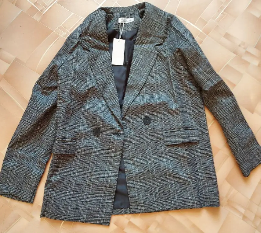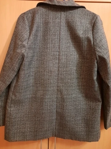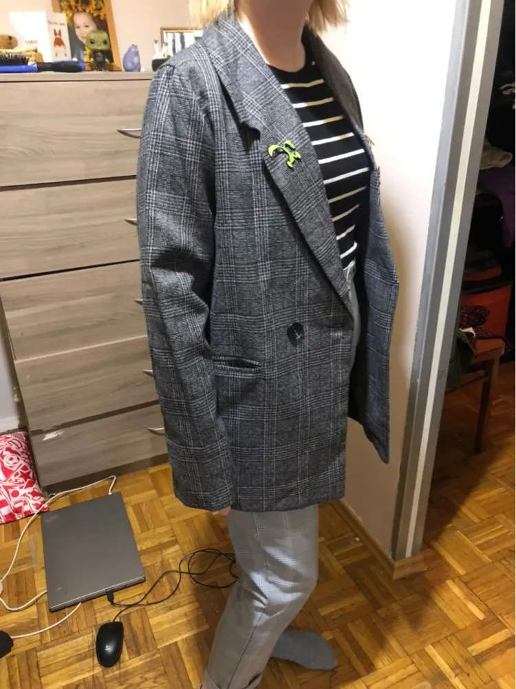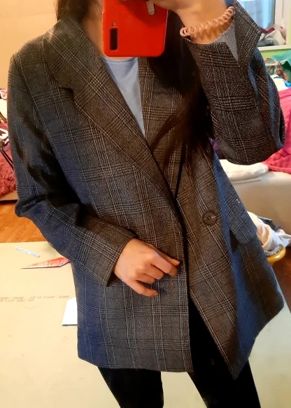 Хороший пиджак, приятная ткань, неколючий, подклад везде аккуратно прошит, цвет красивый, клетка в швах хорошо совпадает по рисунку. На 44 размер - сидит не оверсайз, а прям в размер, плечи на грани (36 см, у меня чуть больше, надеюсь отпарю и сядет получше). Рукава тоже не как на модели, узковаты, разрез совсем небольшой, с подворотом не так свободно смотрятся. Лацканы воротника также шире, чем на фото, буду как-то заутюживать, мне такие слишком широки. Звезду бы сняла, но это мой косяк, не тщательно проверяла размер) длина на рост 165 см хорошая.