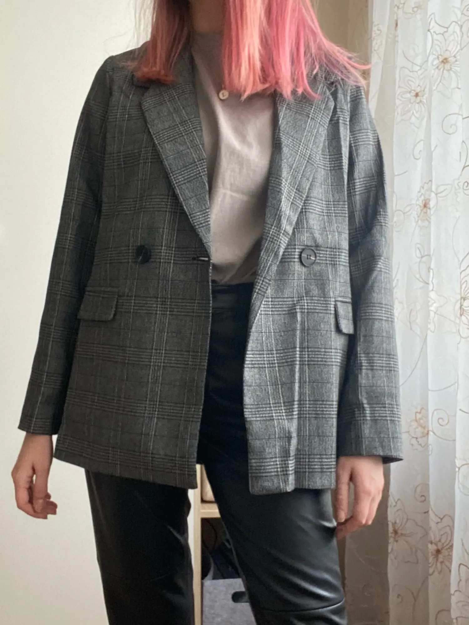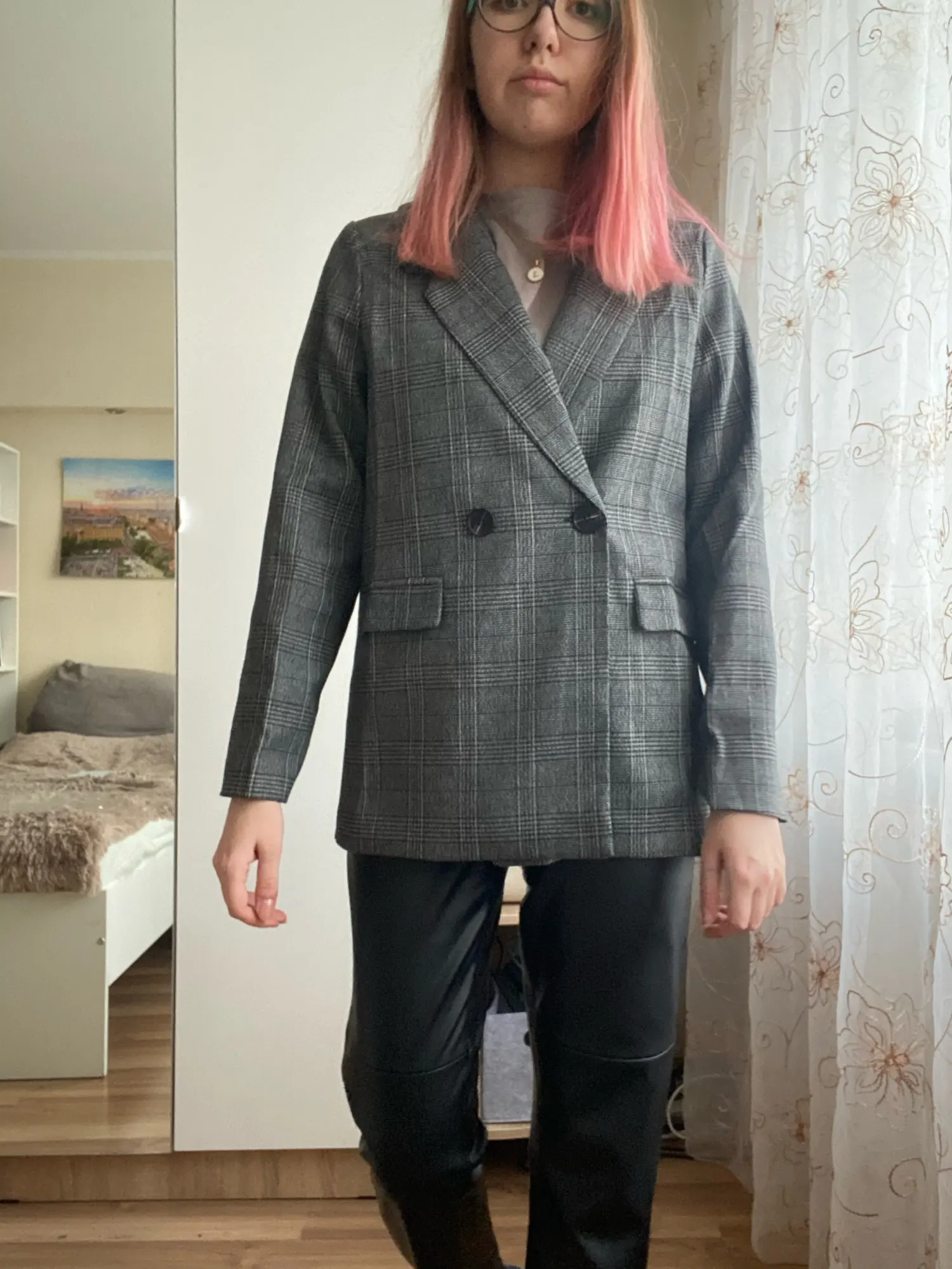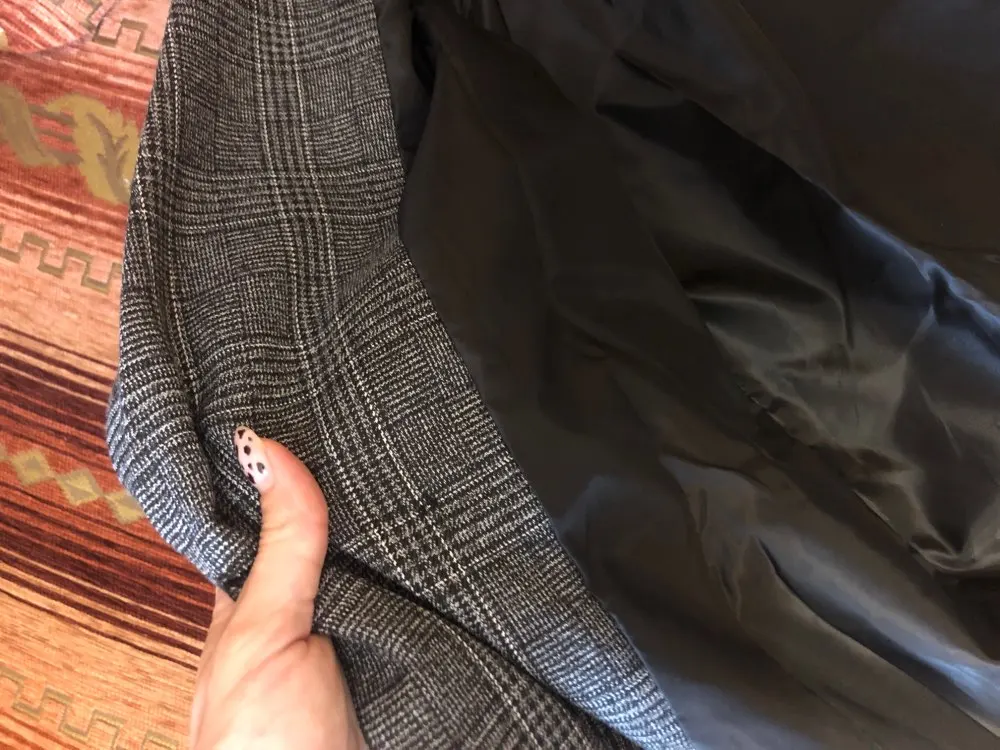 Хороший пиджак, приятная ткань, неколючий, подклад везде аккуратно прошит, цвет красивый, клетка в швах хорошо совпадает по рисунку. На 44 размер - сидит не оверсайз, а прям в размер, плечи на грани (36 см, у меня чуть больше, надеюсь отпарю и сядет получше). Рукава тоже не как на модели, узковаты, разрез совсем небольшой, с подворотом не так свободно смотрятся. Лацканы воротника также шире, чем на фото, буду как-то заутюживать, мне такие слишком широки. Звезду бы сняла, но это мой косяк, не тщательно проверяла размер) длина на рост 165 см хорошая.