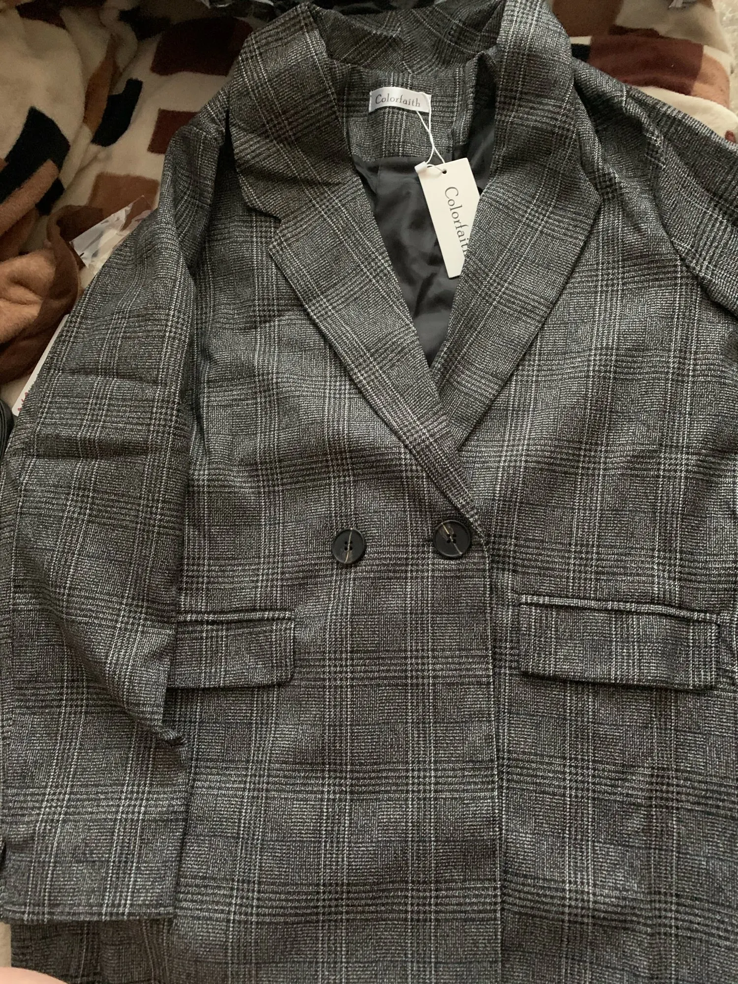 Мой размер 42, кардиган сидит как хороший оверсайз. Абсолютно не приталенный, прямой, выглядит как пиджак прадедушки немного. Я взяла коричневый (на фото выглядит как серый), но я бы назвала цвет ткани не совсем коричневый, а тепло - серый. То есть ткань серая и в ней есть коричневые нитки. Пришел быстро, сзади совпадение клеток не косое, в глаза не бросается.