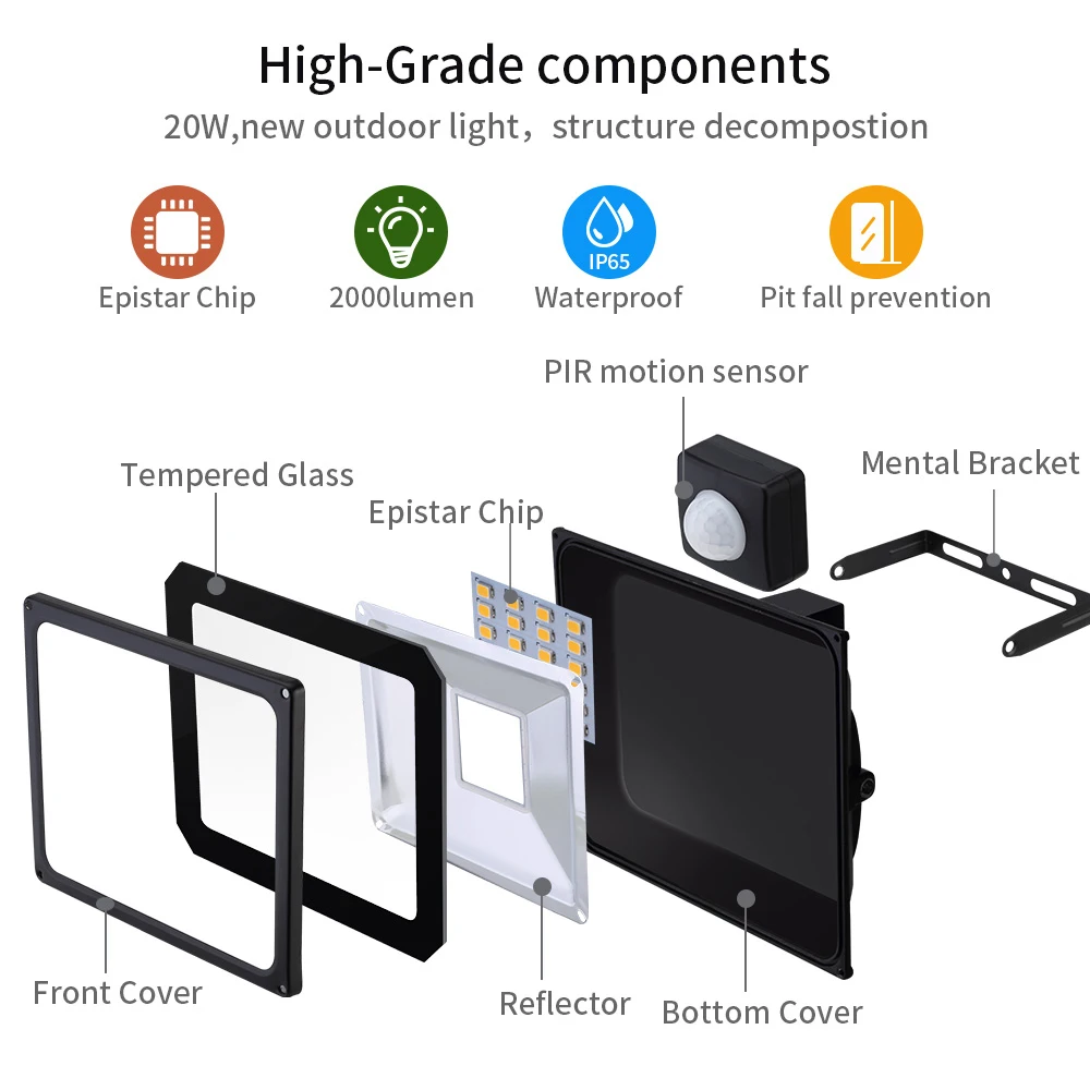 Светодиодный прожектор 20 Вт, сасветильник Точечный светильник с пассивным ИК датчиком движения, светильник емый прожектор, водонепроницаемая уличная настенная лампа, ночсветильник 1600 люмен