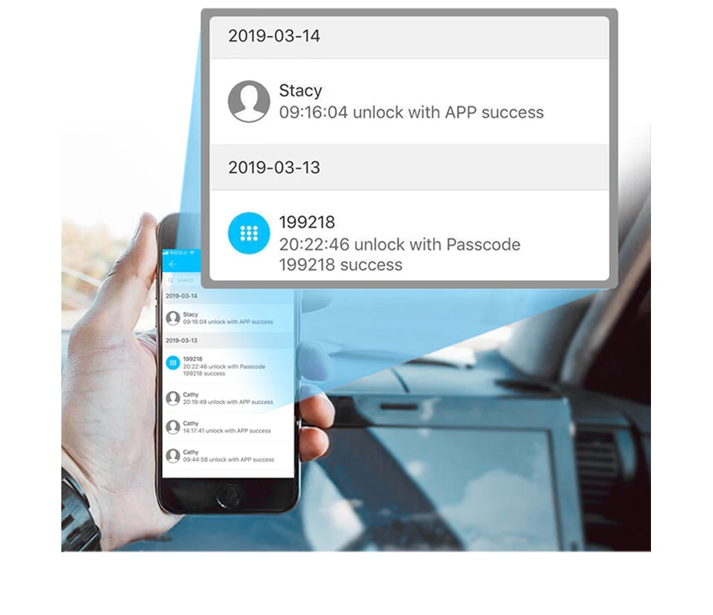 Вы можете легко проверить открытые записи через наше приложение, чтобы следить за тем, кто получил доступ к вашему замку и когда он был получен. Для обеспечения безопасности требуется только мобильный телефон.