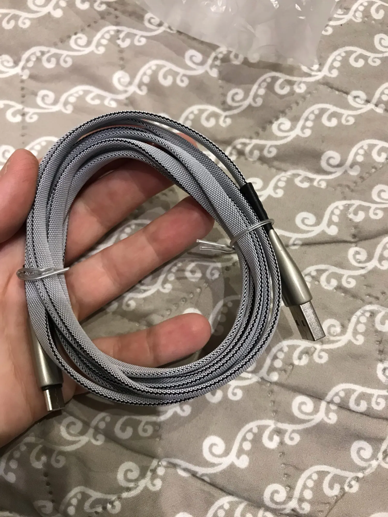 Доехало за 15 дней. Провод на ощупь тканный, но он жёсткий и сохраняет формы перегибов (если размотать и растянуть по всей длине, то будет не ровненкий) Про пропускную способность ничего не скажу (