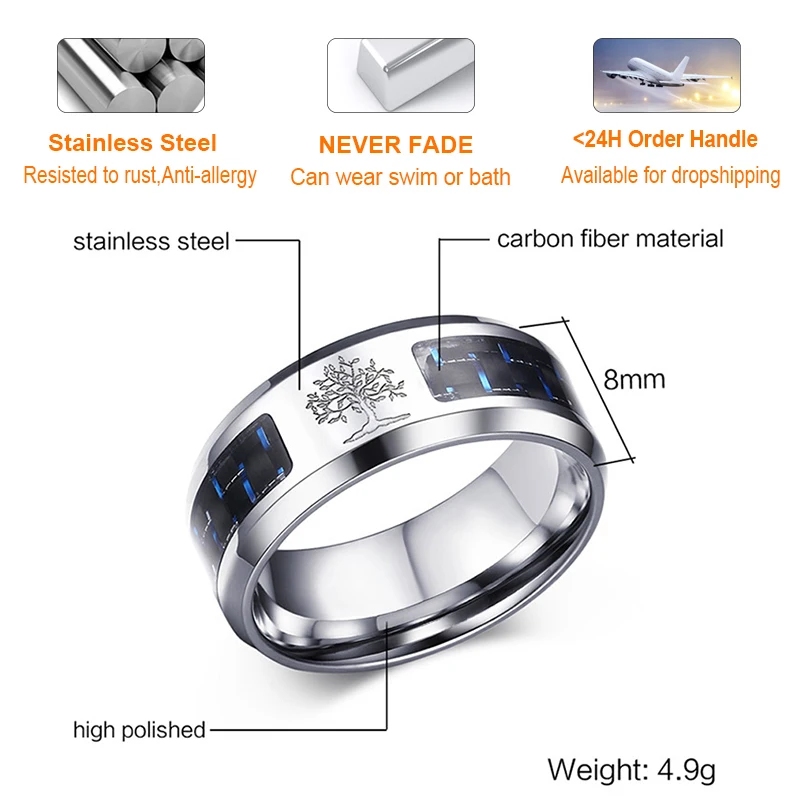 Мужское кольцо из углеродного волокна, 8 мм, с гравировкой Древа Жизни