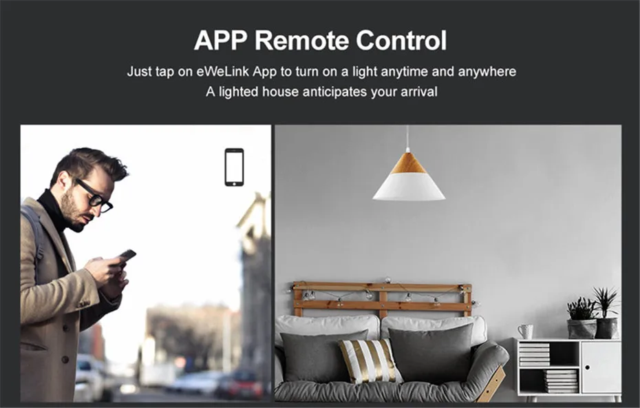 Просто нажмите на приложение eWeLink, чтобы включить светильник в любое время и в любом месте. Зажженный дом ожидает вашего прибытия.