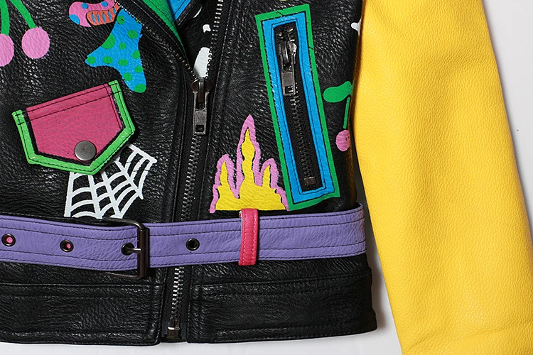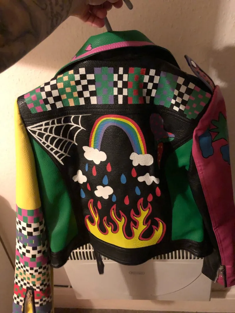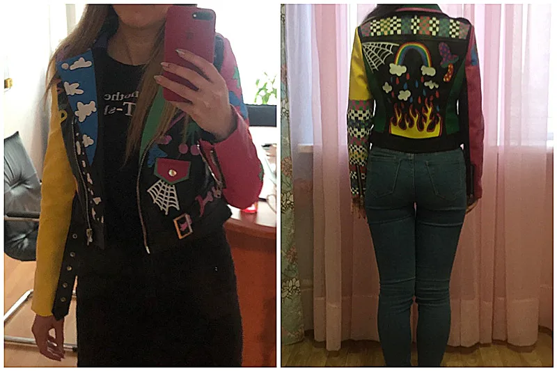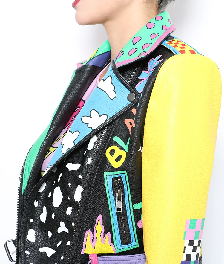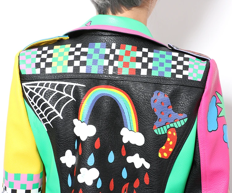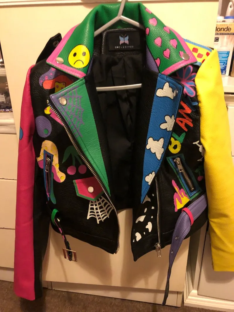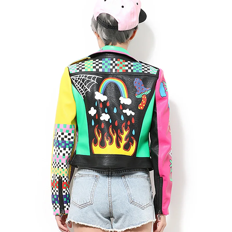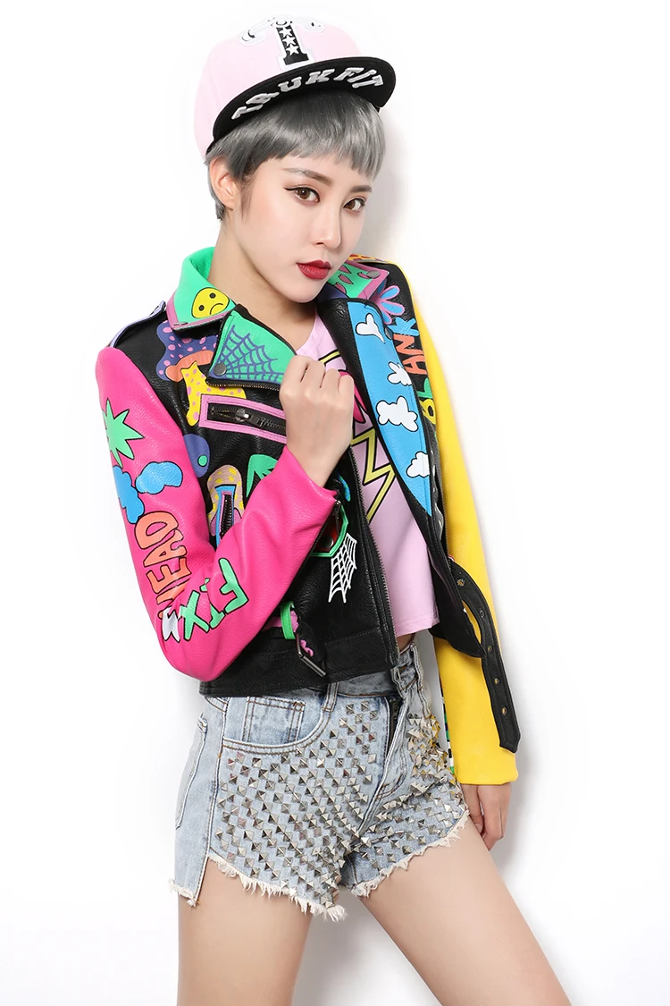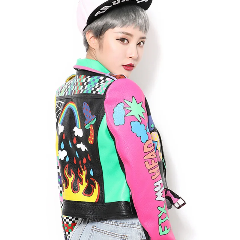 Женская кожаная куртка в стиле панк-рок на молнии с заклепками, короткая укороченная металлическая куртка из искусственной кожи с граффити, женские мотоциклетные топы из искусственной кожи