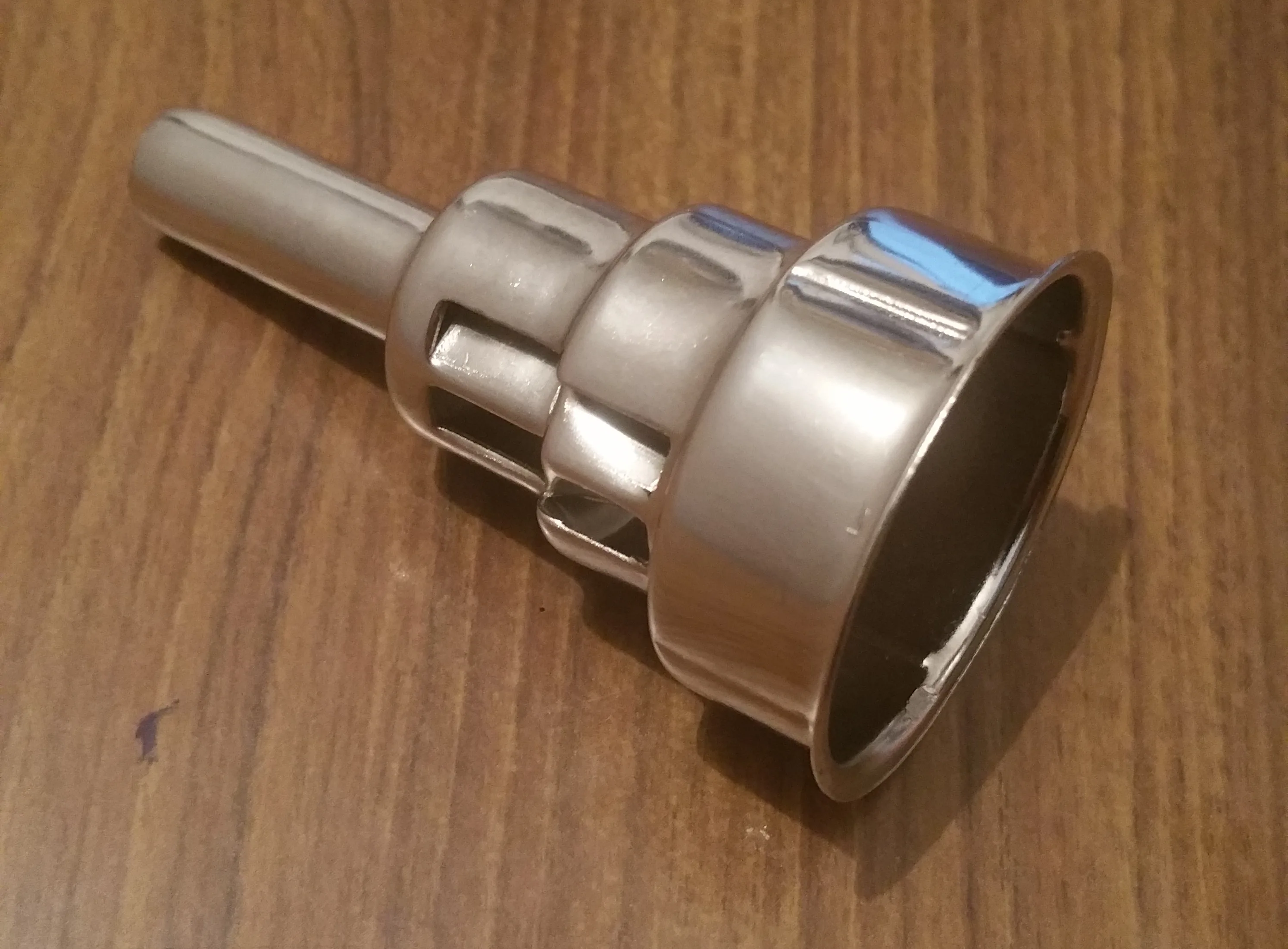 Внутри сопла имеются 4 ребра они уменьшают внутренний диаметр, соответственно на 33 мм фен оно не подходит. Нужно обязательно допиливать и убирать эти ребра. Дело минутное, но сам факт расстраивает.