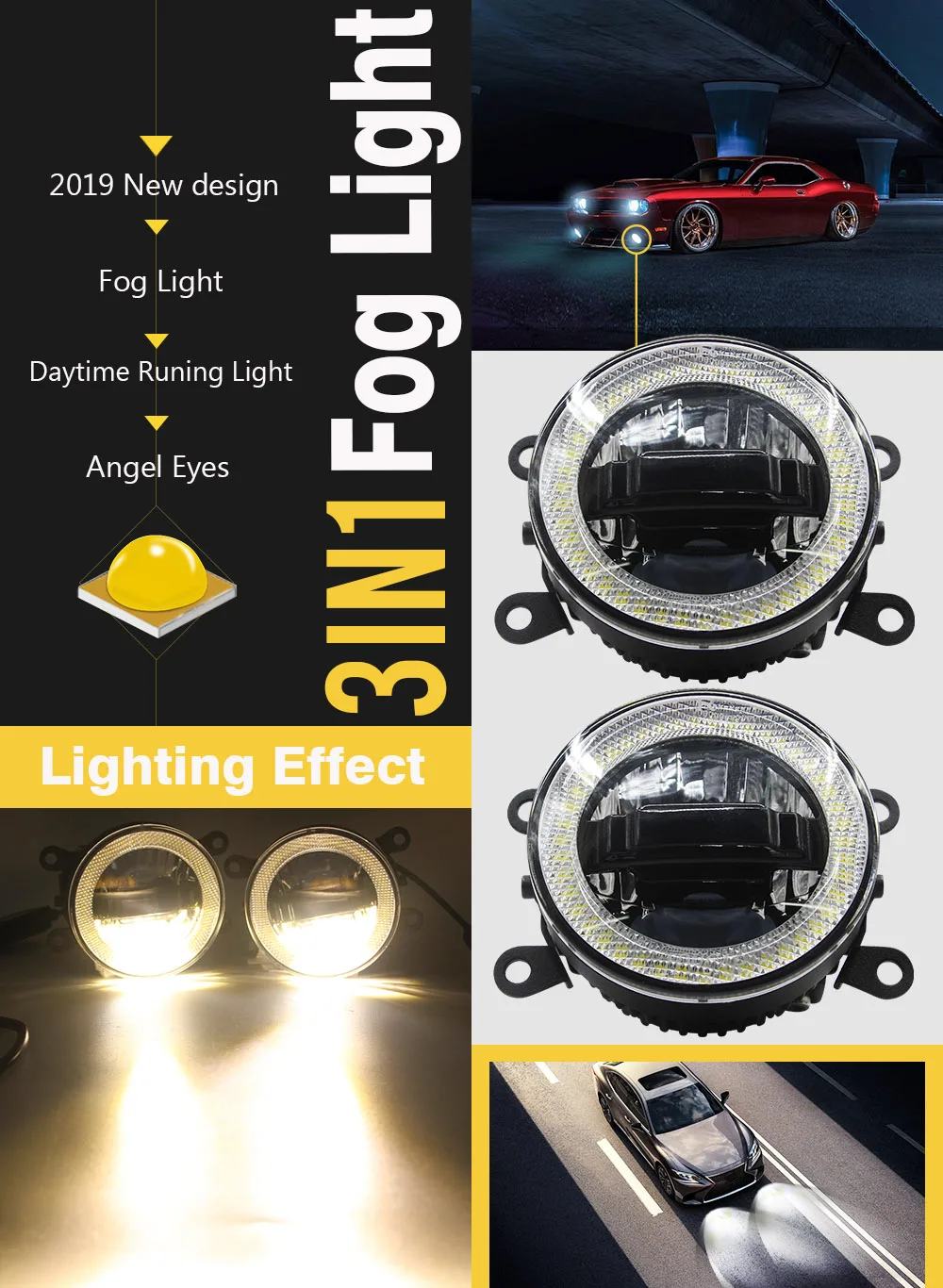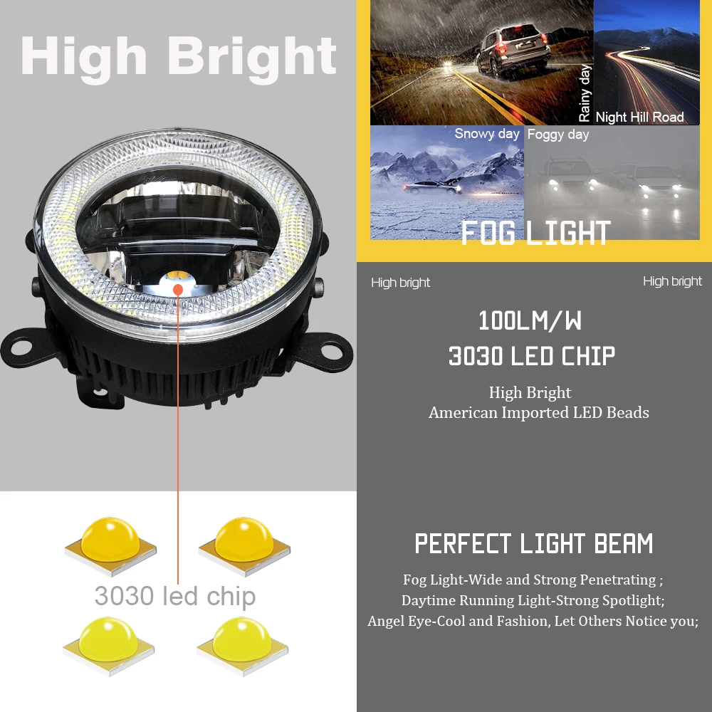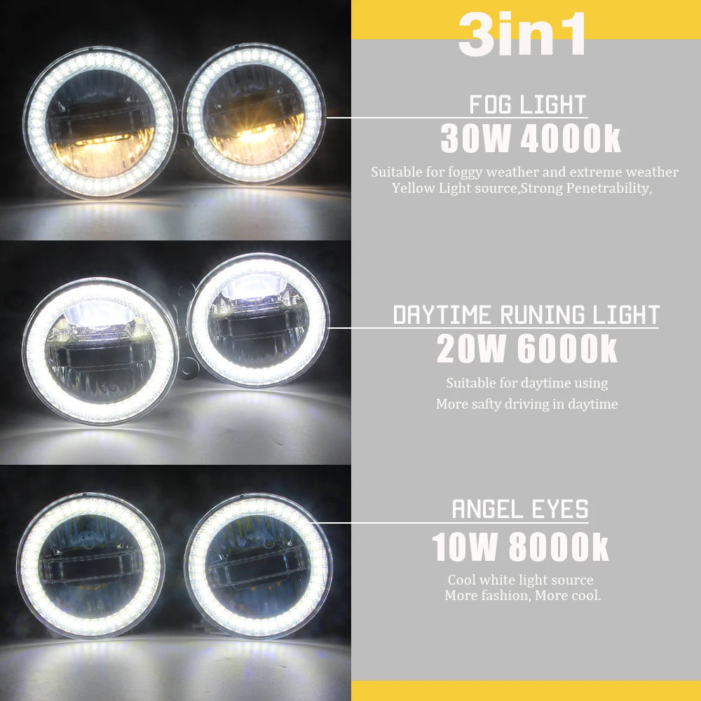 -3в1 светодиодный светильник-это новейший дизайн 2019 года; Противотуманный светильник, дневной ходовой светильник и Ангельский глаз-все это в одной лампе; Вы можете использовать противотуманный светильник в экстремальную погоду, DRL в дневное время, angel eye сделает ваш автомобиль более крутым и модным, пусть другие заметят вас;