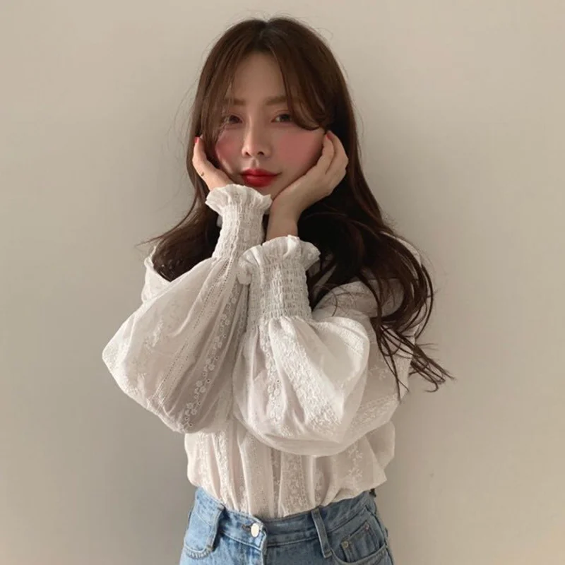 2022 модные женские кружевные блузки с длинным рукавом, белые женские топы, повседневная женская одежда с круглым вырезом и цветочным принтом, милый стиль 6137 50