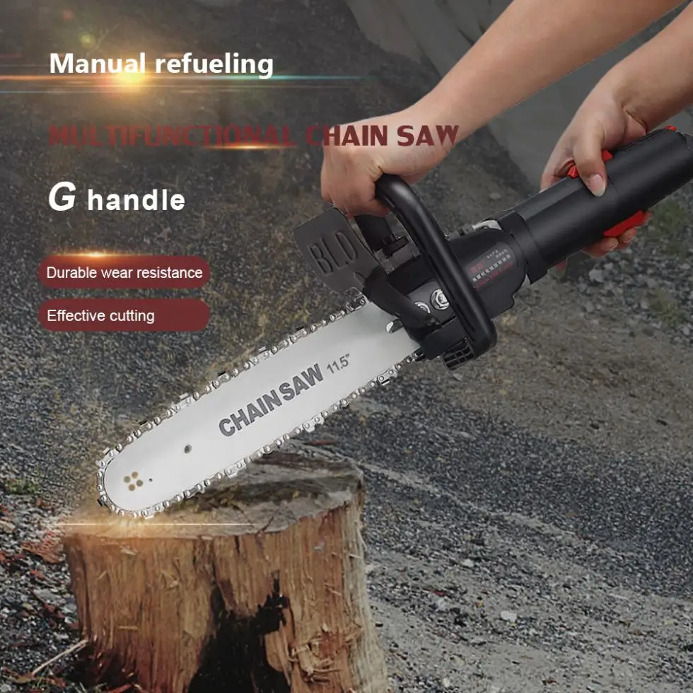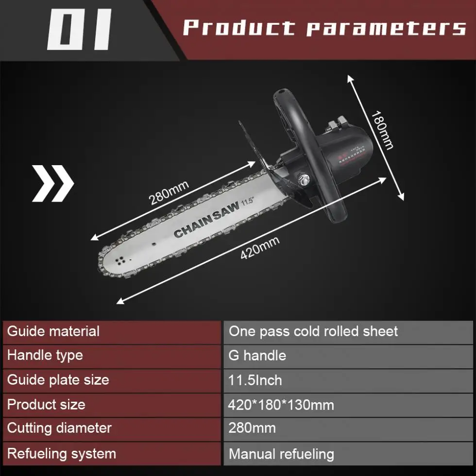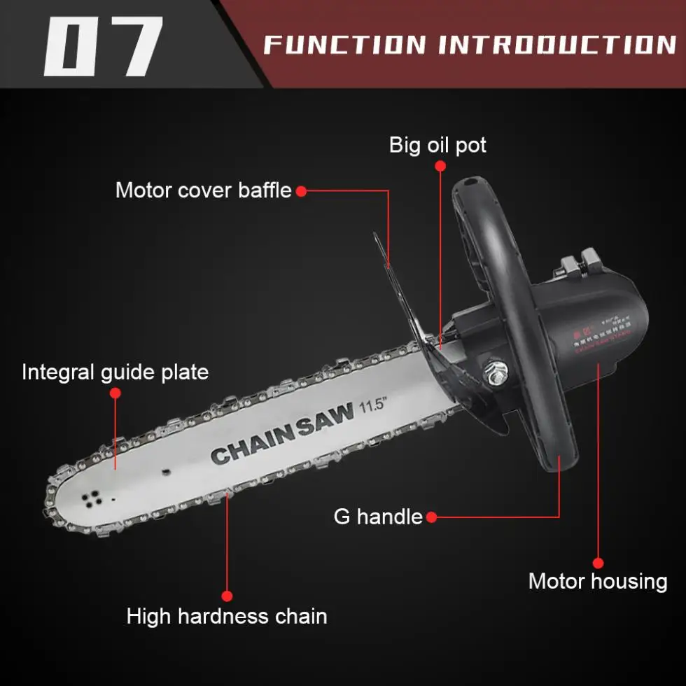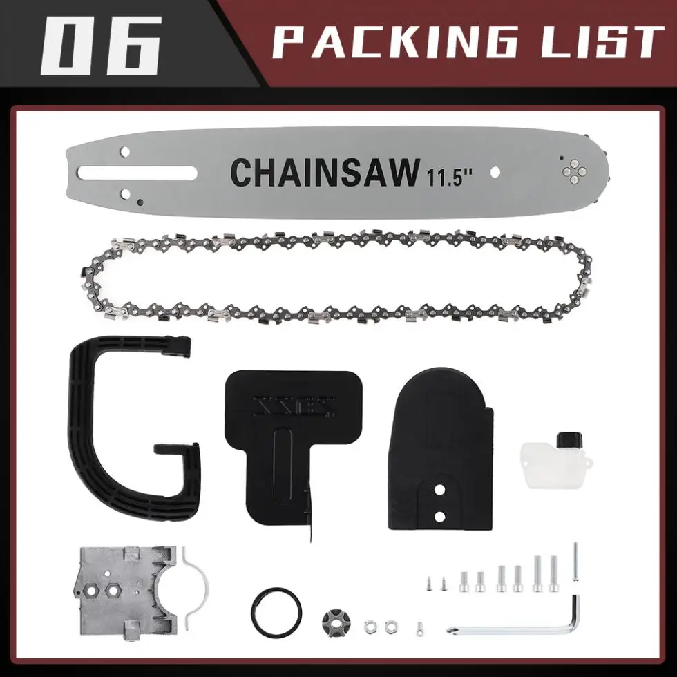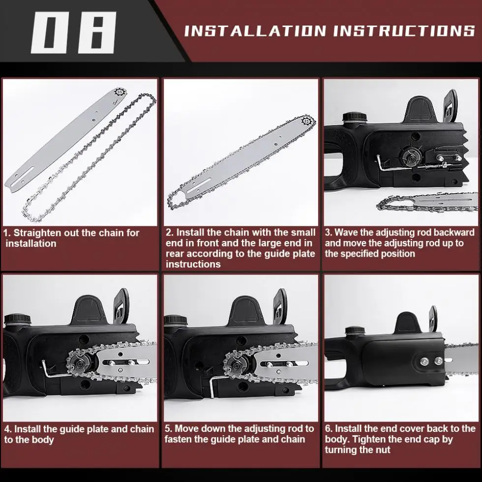 -Электрическая цепная пила преобразователь подходит для 4 дюйма (100 мм) Электрическая угловая шлифовальная машина с M10 ходовой резьбы. Если вы хотите затянуть цепь или ослабить цепь, сначала вам нужно распустить шестигранные винты на черной доске, затем вы можете распускать или затянуть винт с помощью отвертки, когда вы чувствуете, что цепь подходит для вашей работы, вы можете зафиксировать шестигранный винт снова и использовать цепную пилу.