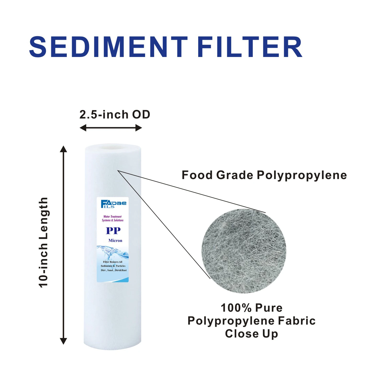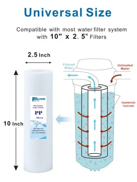 20 микрон осадочный фильтр для воды картриджи 2-1/2 "x10in. Изготовлены из расплава выдувного полипропилена. Эти полипропиленовые фильтры для воды уменьшают количество осадков, грязи, песка, ила, ржавчины, известкового налета и других примесей в вашей воде. И предлагает отличную химическую стойкость и высокую емкость удержания грязи, также надежное и экономичное решение для предварительной фильтрации во многих применениях. Обычно используется для предварительной фильтрации в системах обратного осмоса и постфильтрации в фильтрах GAC