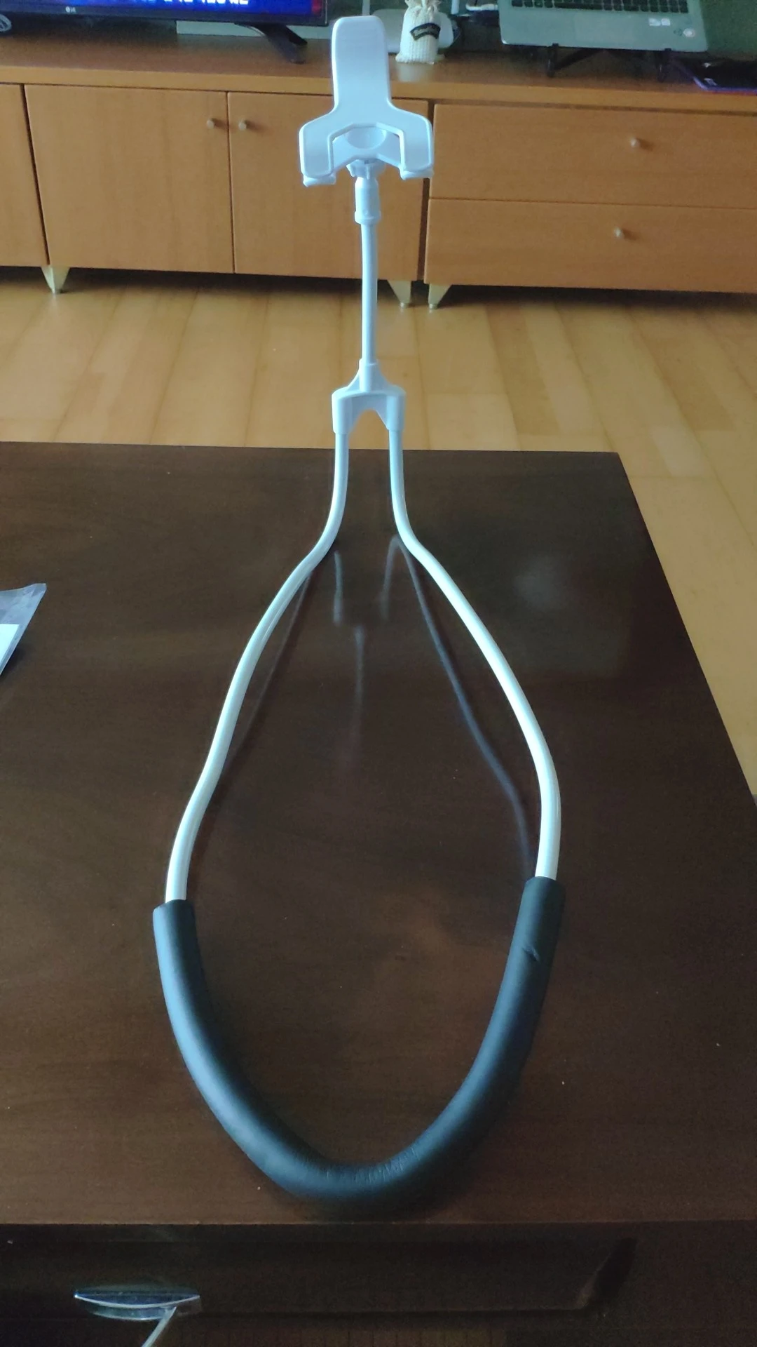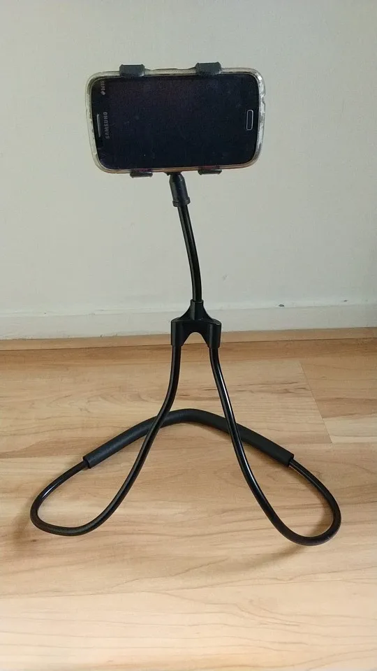 Это здорово! Очень доволен товаром. Он очень гибкий и универсальный. Единственное, что у вас есть вокруг шеи, вы не можете иметь телефон в хорошем вертикальном положении, просто горизонтально. И в зависимости от того, как вы его сгибаете, вся вещь может немного отскакивать, когда вы нажимаете на телефон, и это, вероятно, утомит ваши глаза. Но для просмотра фильма/видео это идеально. Не забудьте сначала поставить телефон на него, прежде чем настроить его, потому что телефон весит его вниз!