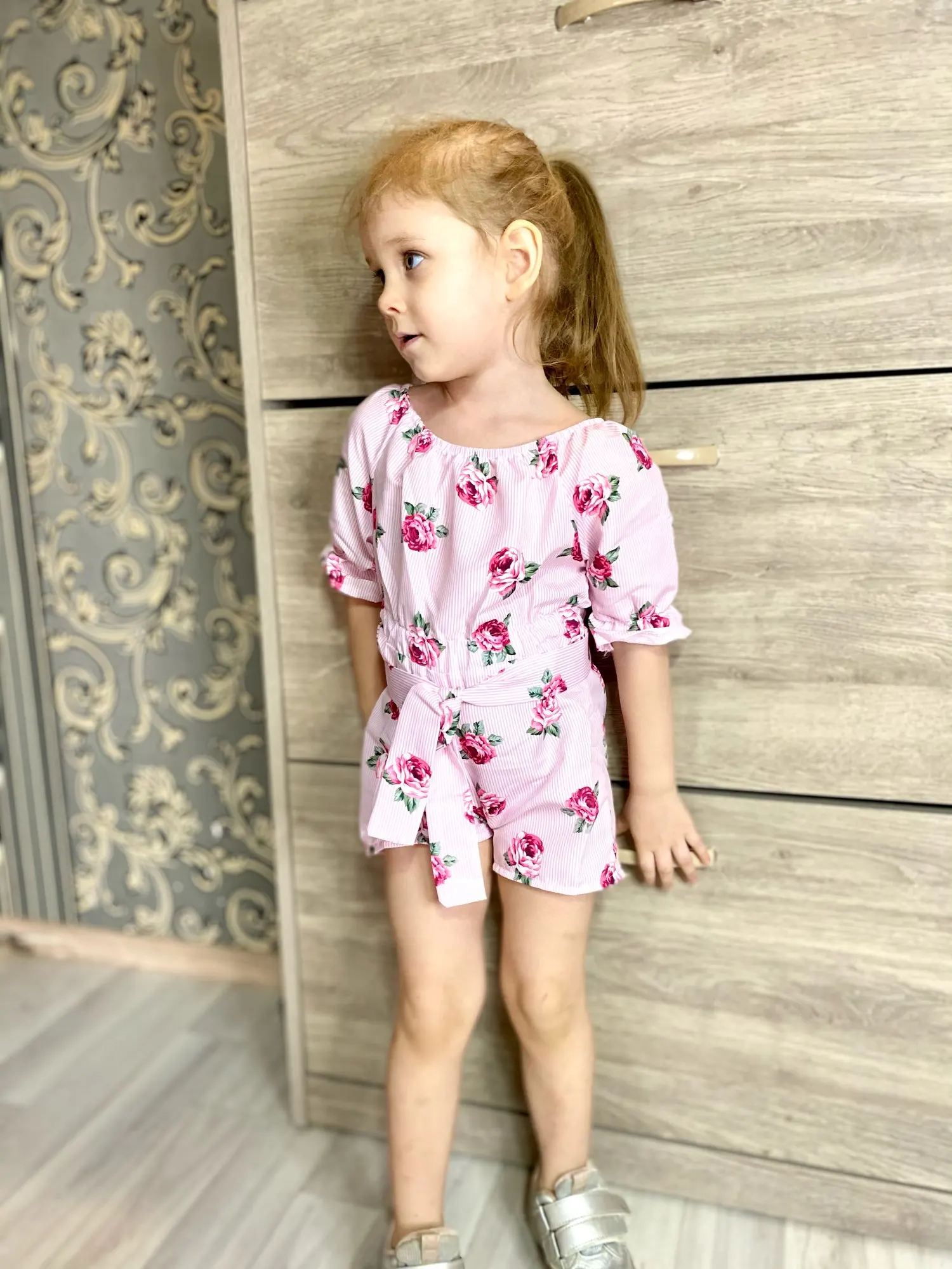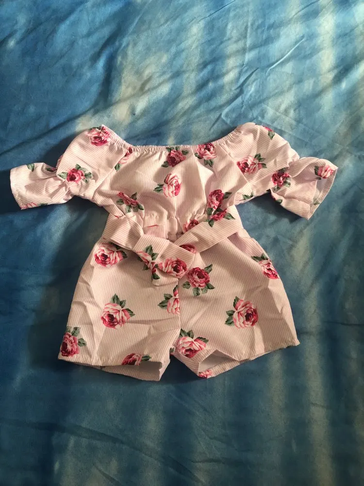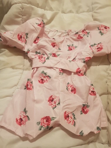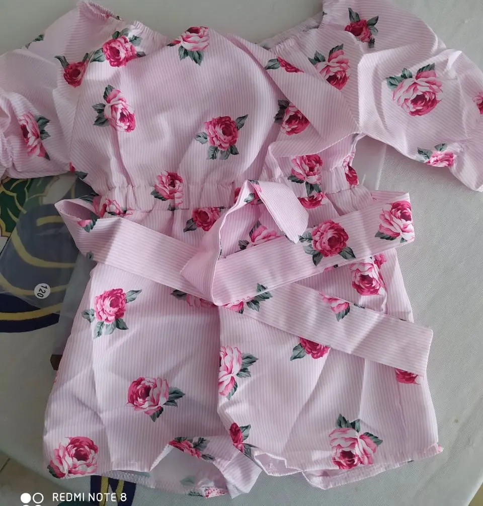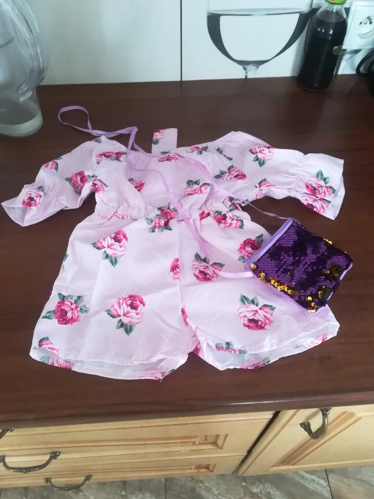Можно встретить неровные шовчики и торчащие ниточки. Комбез очень маломерит. Для дочки ростом 100см заказала размер 4Т, сел очень впритык. Запаса ноль, да и сейчас некомфортно сидит по росту. Очень жаль. Ткань хлопковая, не тянется. Яркий и красивый принт. Комбинезон без молнии, застежек и пуговиц, одевается снизу вверх, через шортики. Плечики можно опускать или поднимать, кому как нравится. Есть пришитый поясок. Если решили заказать , то советую взять вам не на размер, а на два-три больше. Нам, к сожалению, комбинезон не пригодится, так как маленький